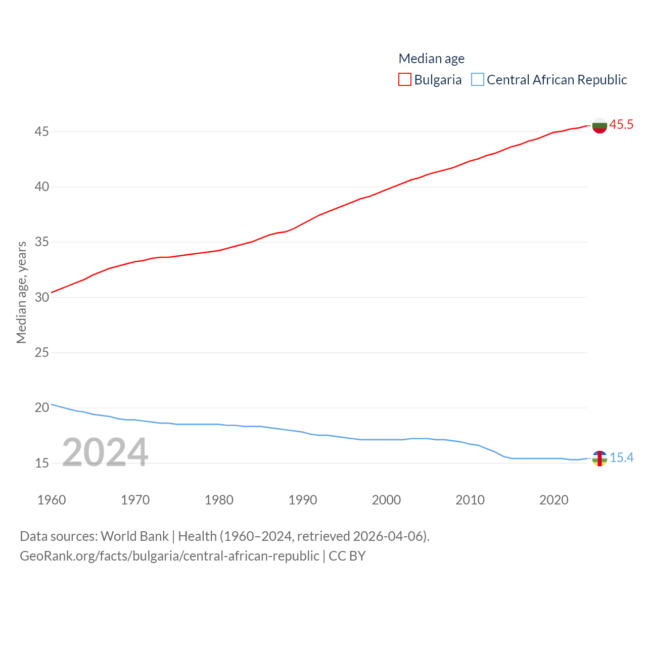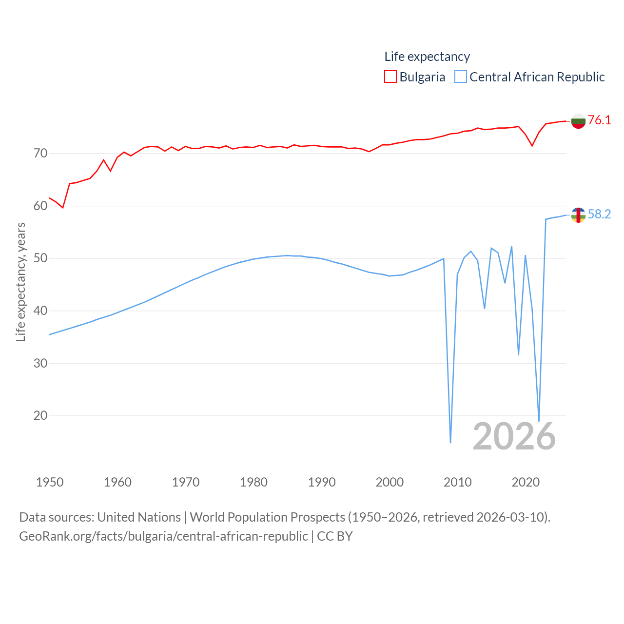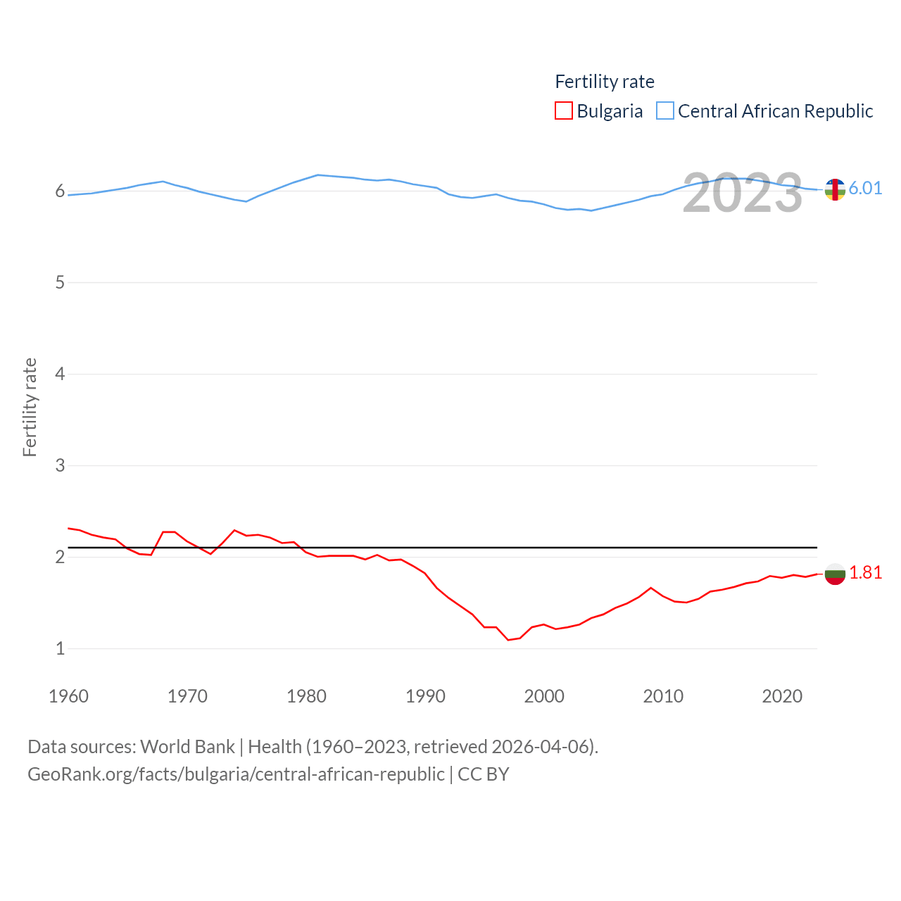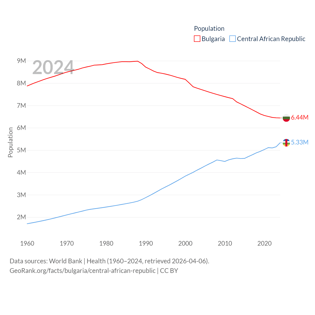 Bulgaria has a population of 6.44M (ranked 110/197), compared with 5.33M in The Central African Republic (ranked 121/197). Bulgaria's land area is 41,915 sq mi versus 240,534 sq mi for The Central African Republic (ranked 101st vs. 43rd).