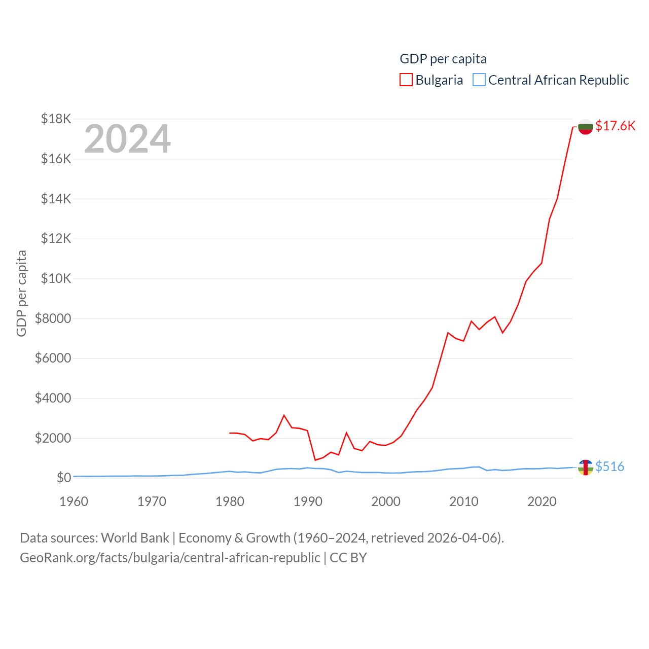By GDP, Bulgaria ranks 67/197 ($113B) and The Central African Republic ranks 171/197 ($2.75B). By GDP per capita, Bulgaria ranks 64/197 ($17,596), while The Central African Republic ranks 195/197 ($516).
