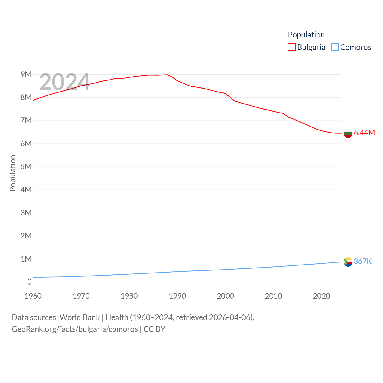 Bulgaria has a population of 6.44M (ranked 110/197), compared with 867K in Comoros (ranked 160/197). Bulgaria's land area is 41,915 sq mi versus 719 sq mi for Comoros (ranked 101st vs. 171st).