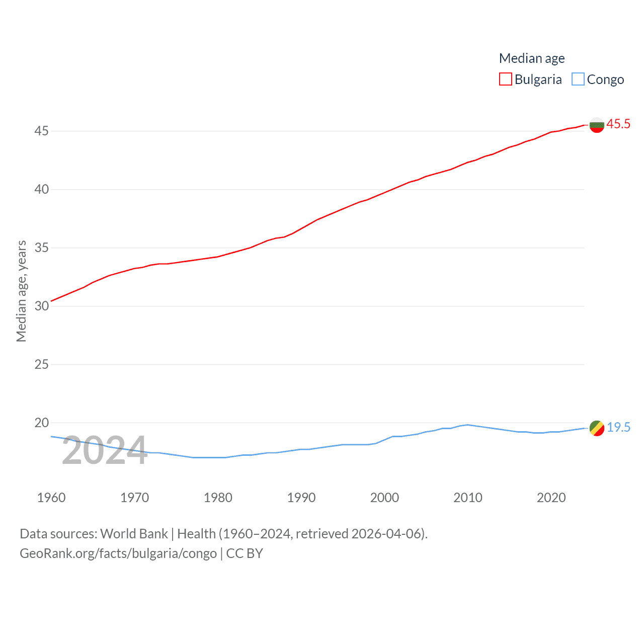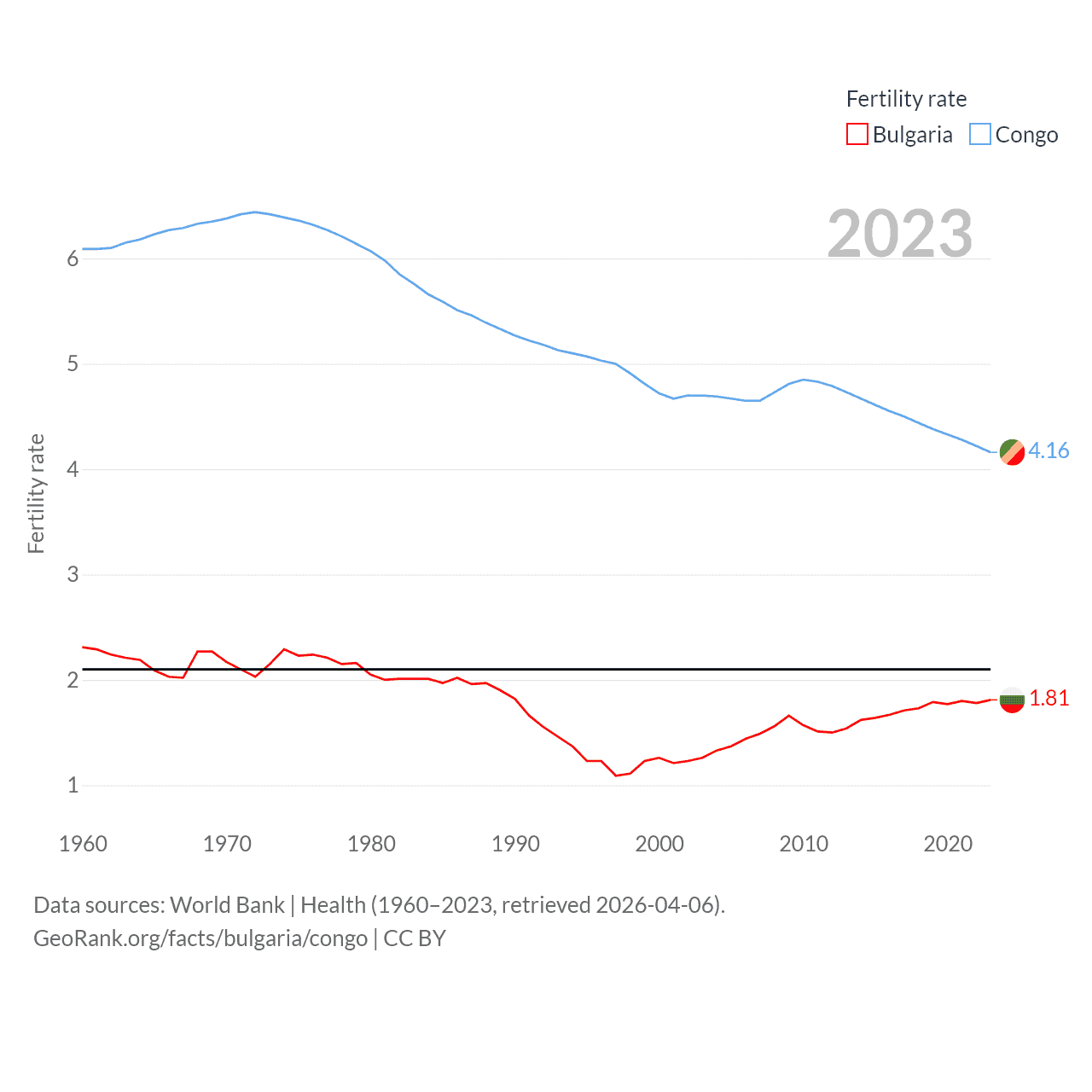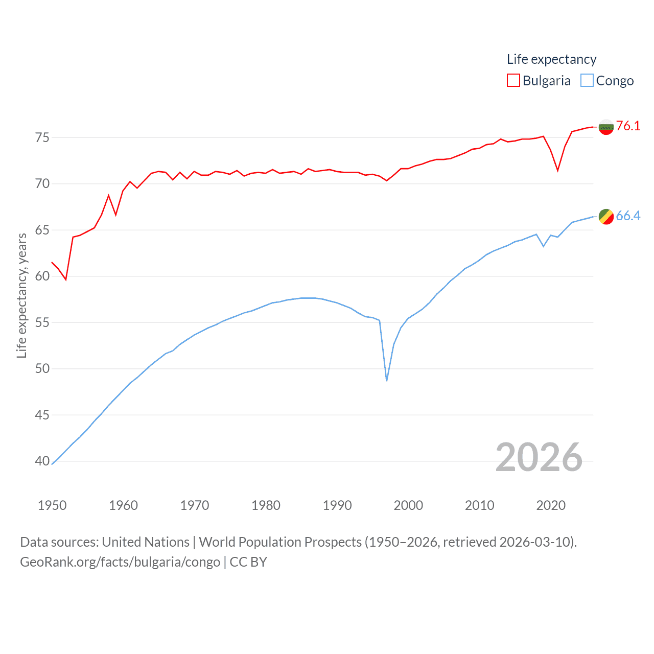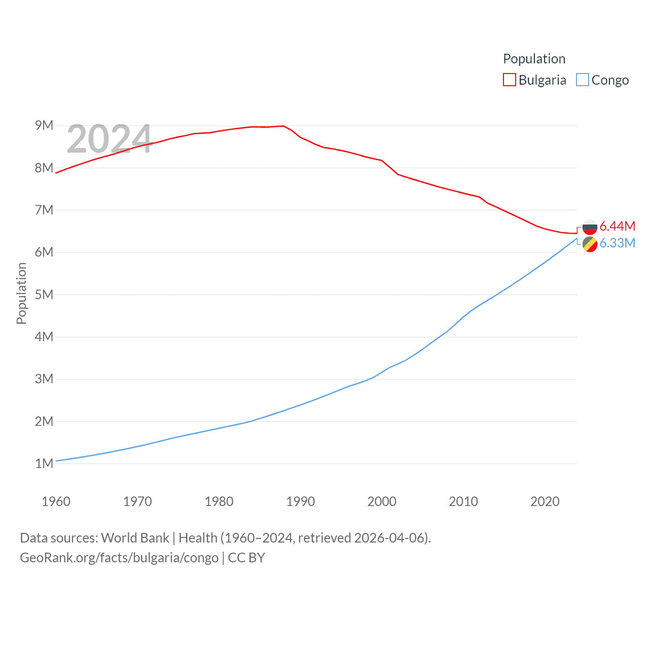 Bulgaria has a population of 6.44M (ranked 110/197), compared with 6.33M in The Congo (ranked 112/197). Bulgaria's land area is 41,915 sq mi versus 131,854 sq mi for The Congo (ranked 101st vs. 64th).