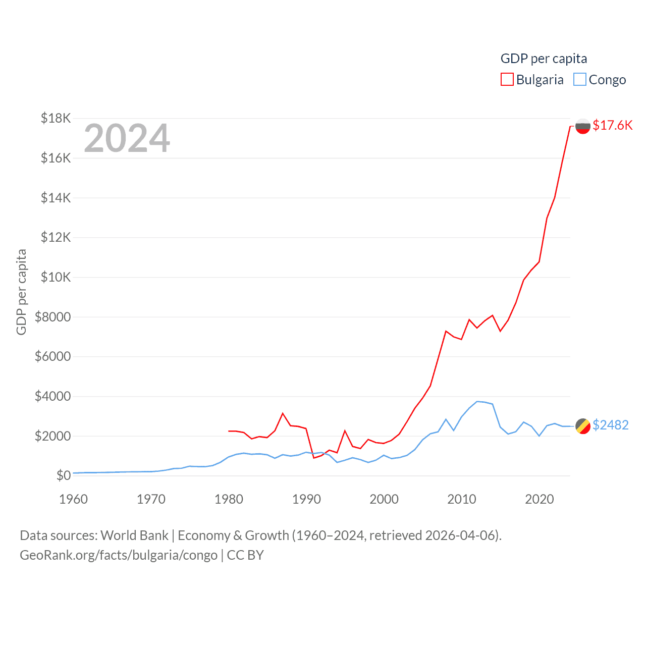 By GDP, Bulgaria ranks 67/197 ($113B) and The Congo ranks 141/197 ($15.7B). By GDP per capita, Bulgaria ranks 64/197 ($17,596), while The Congo ranks 149/197 ($2,482).