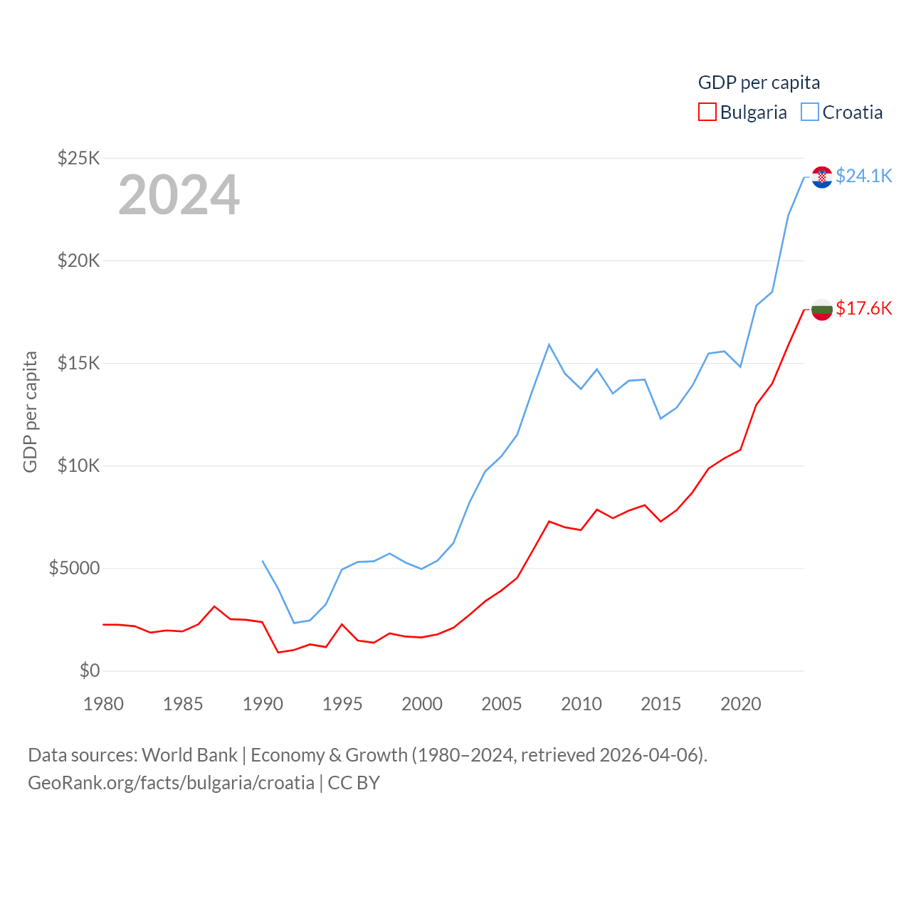 By GDP, Bulgaria ranks 67/197 ($113B) and Croatia ranks 75/197 ($93B). By GDP per capita, Bulgaria ranks 64/197 ($17,596), while Croatia ranks 50/197 ($24,050).