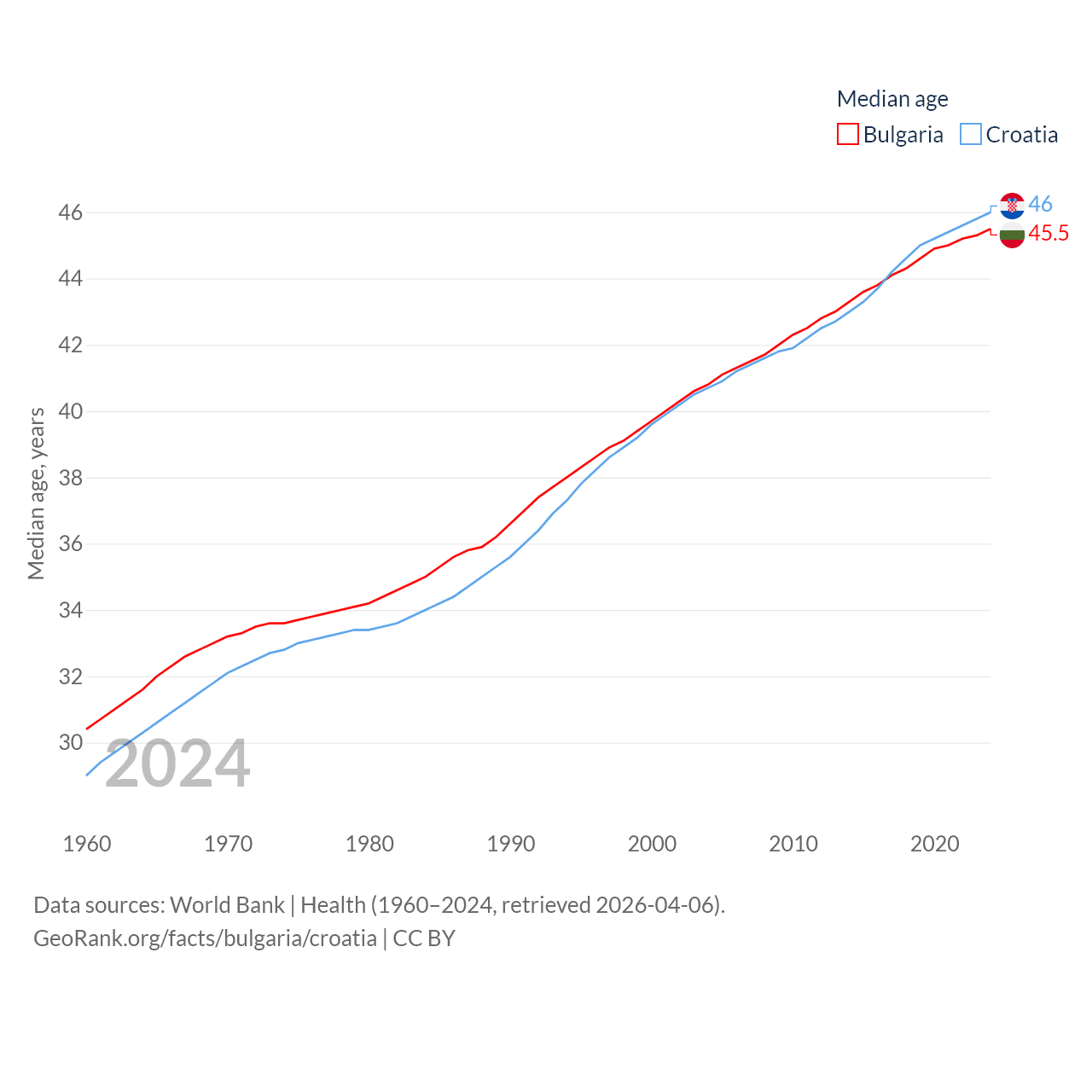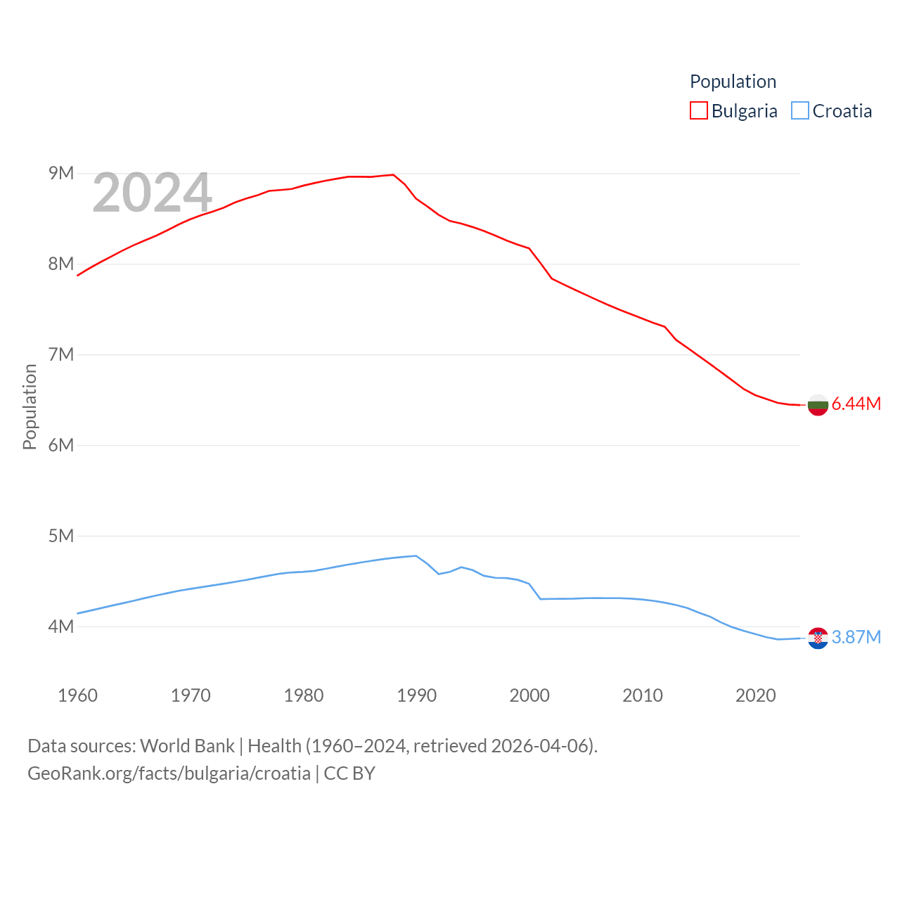 Bulgaria has a population of 6.44M (ranked 110/197), compared with 3.87M in Croatia (ranked 129/197). Bulgaria's land area is 41,915 sq mi versus 21,606 sq mi for Croatia (ranked 101st vs. 123rd).