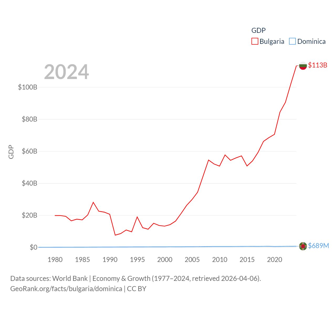 By GDP, Bulgaria ranks 67/197 ($113B) and Dominica ranks 190/197 ($689M). By GDP per capita, Bulgaria ranks 64/197 ($17,596), while Dominica ranks 84/197 ($10,405).