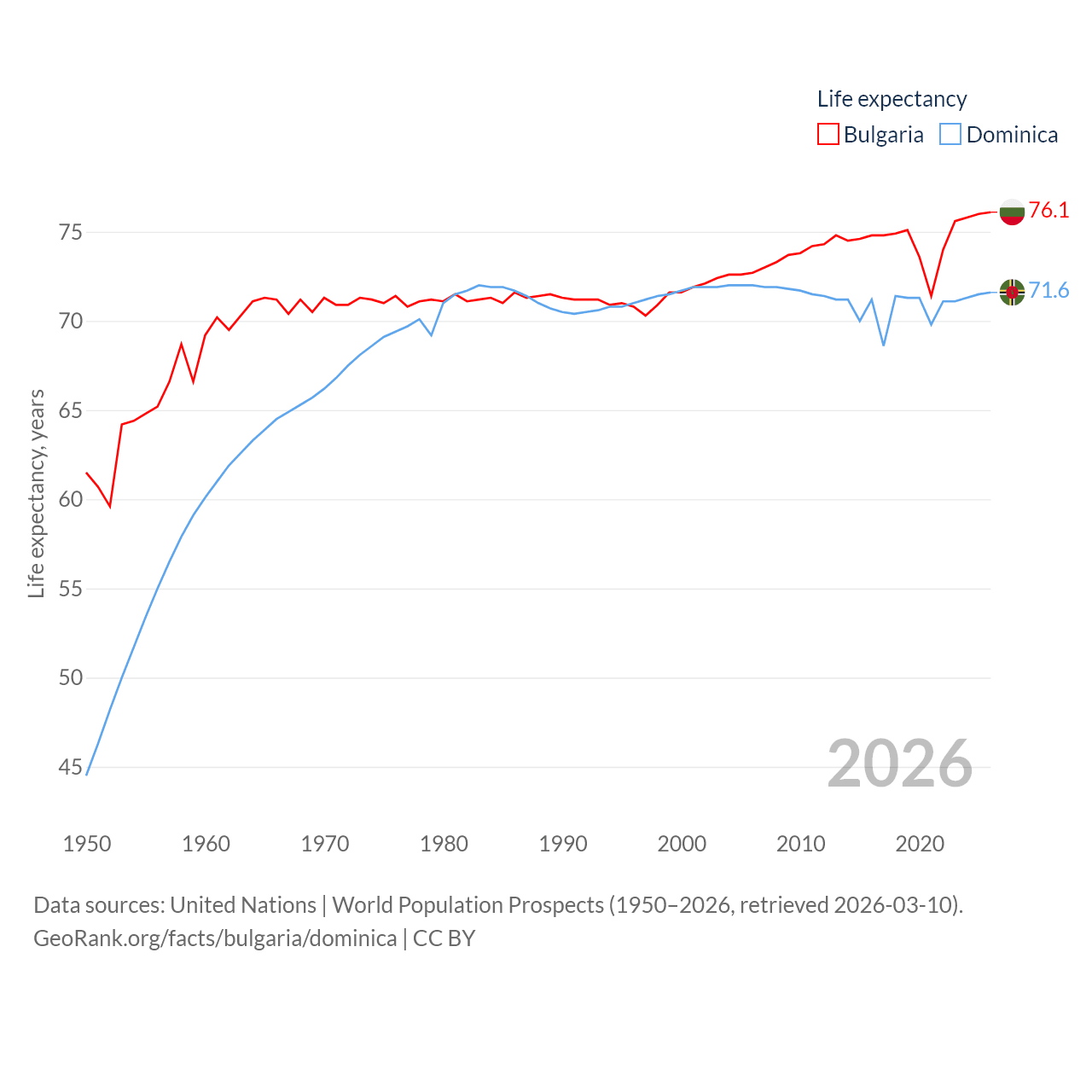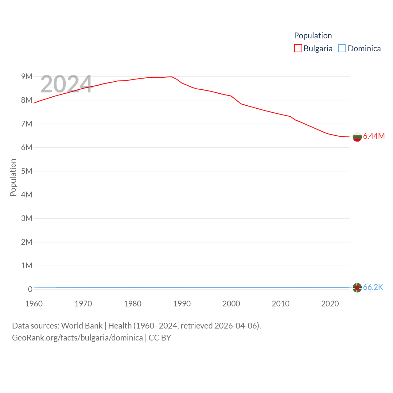 Bulgaria has a population of 6.44M (ranked 110/197), compared with 66.2K in Dominica (ranked 188/197). Bulgaria's land area is 41,915 sq mi versus 289.6 sq mi for Dominica (ranked 101st vs. 175th).
