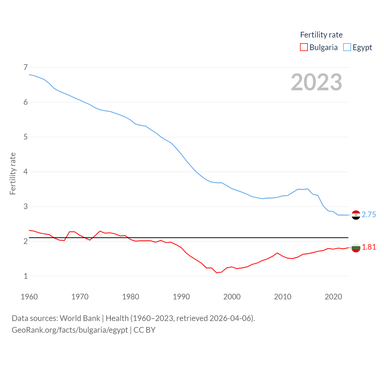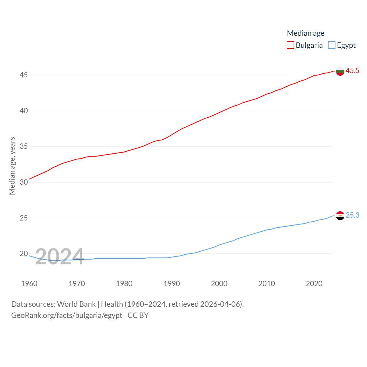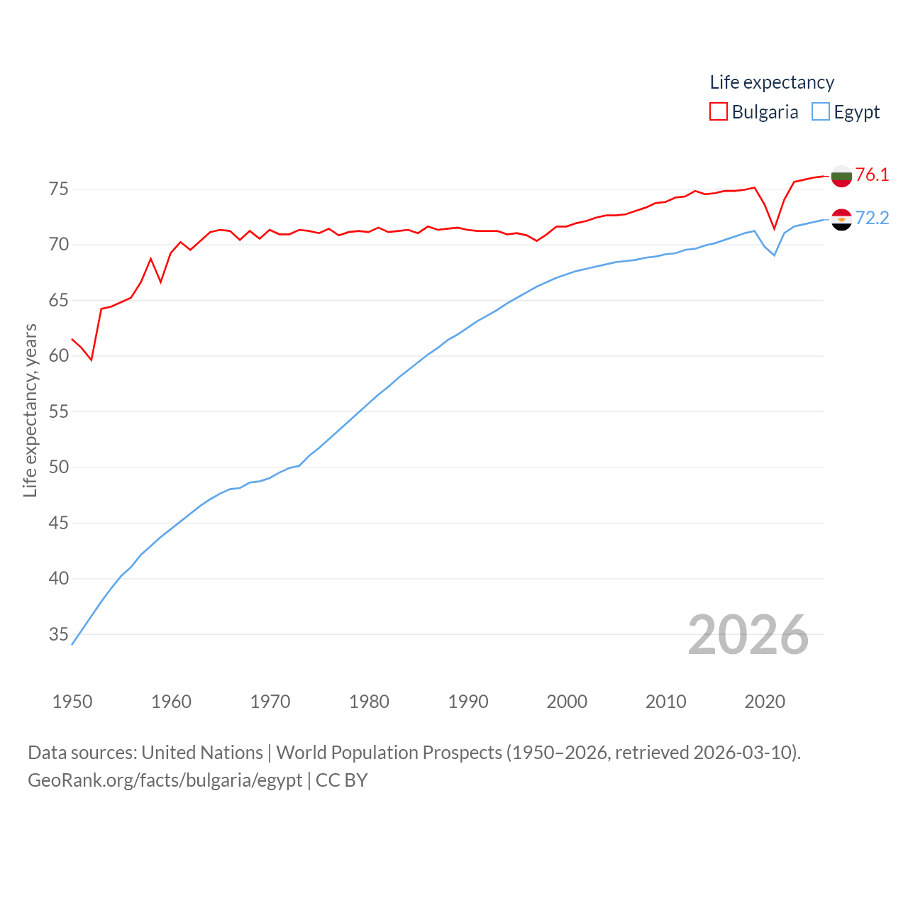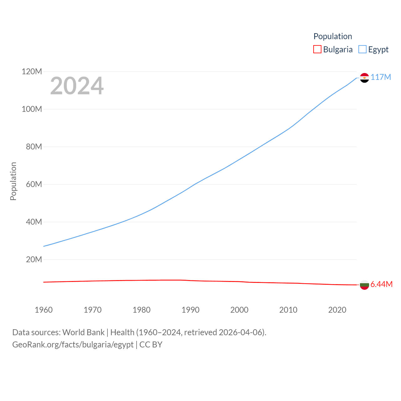 Bulgaria has a population of 6.44M (ranked 110/197), compared with 117M in Egypt (ranked 13/197). Bulgaria's land area is 41,915 sq mi versus 384,345 sq mi for Egypt (ranked 101st vs. 29th).