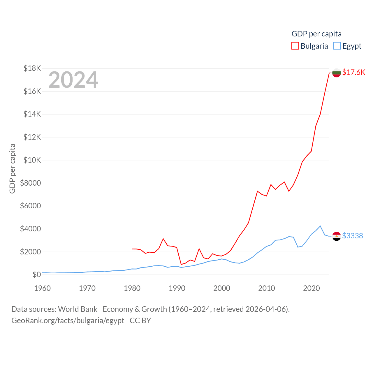 By GDP, Bulgaria ranks 67/197 ($113B) and Egypt ranks 41/197 ($389B). By GDP per capita, Bulgaria ranks 64/197 ($17,596), while Egypt ranks 138/197 ($3,338).