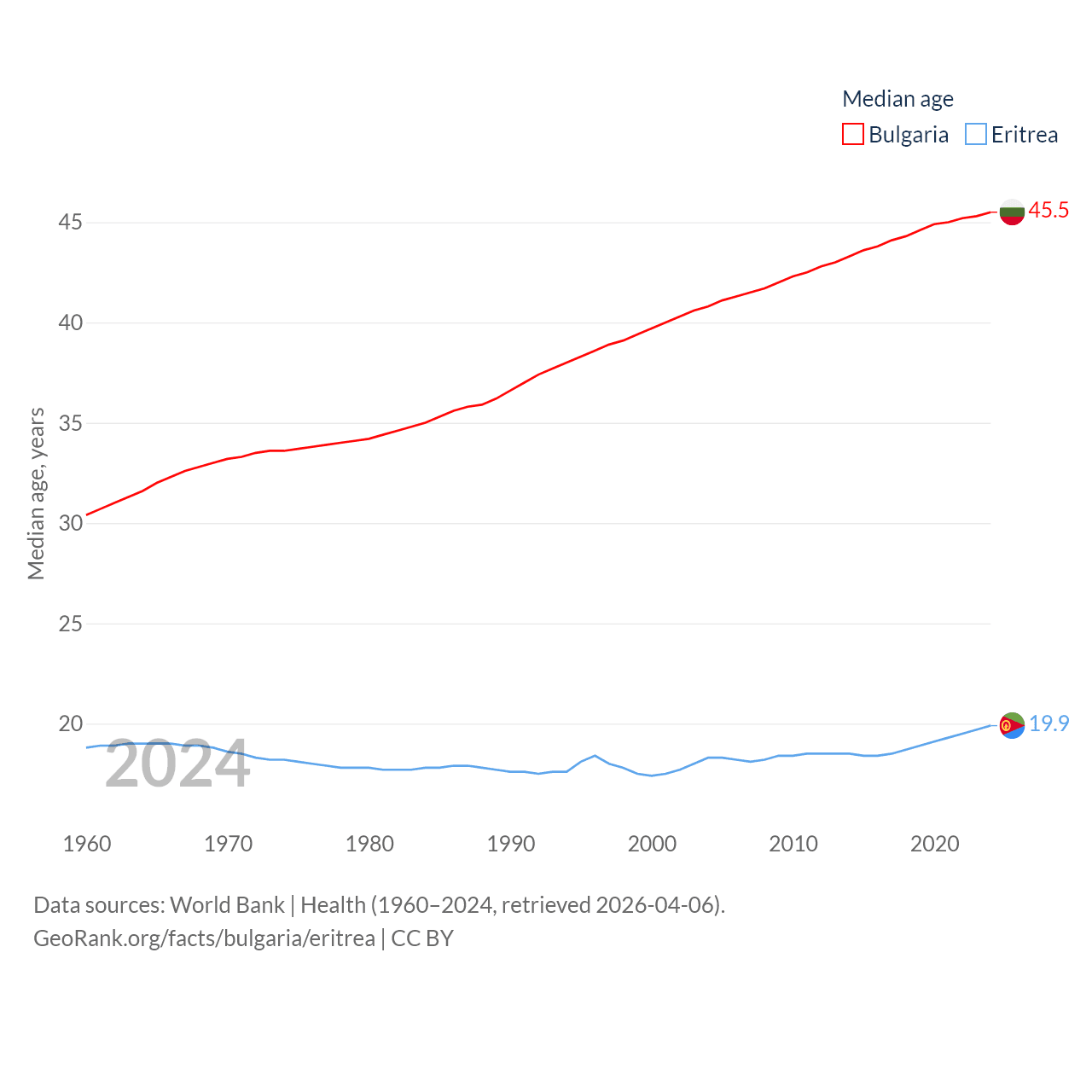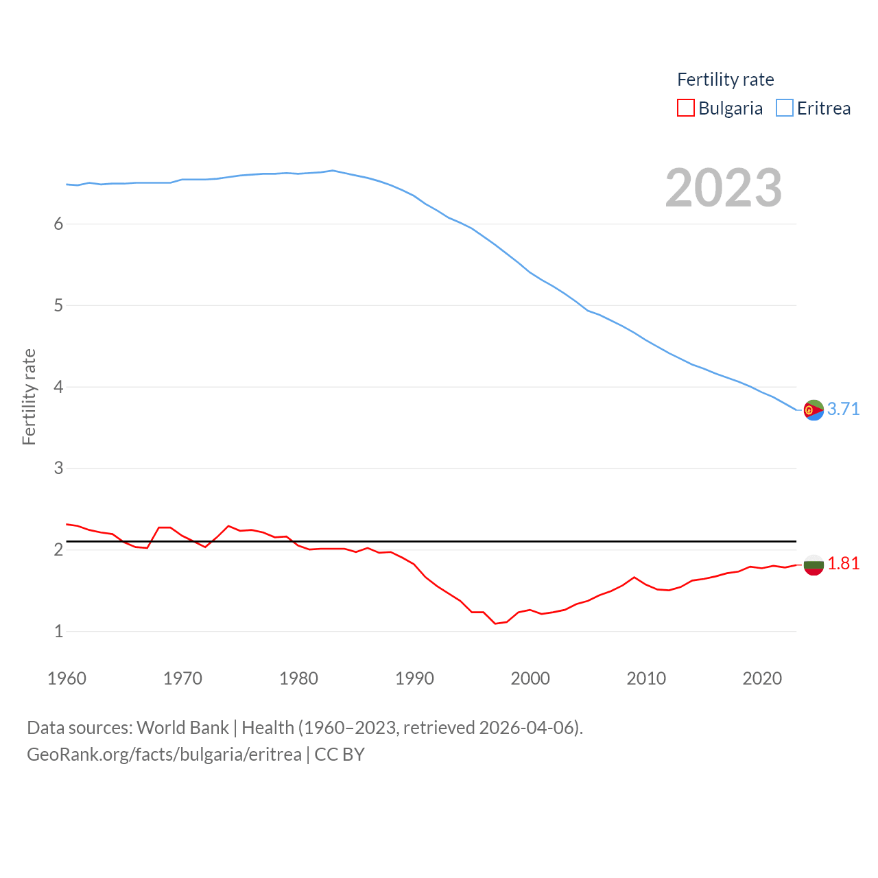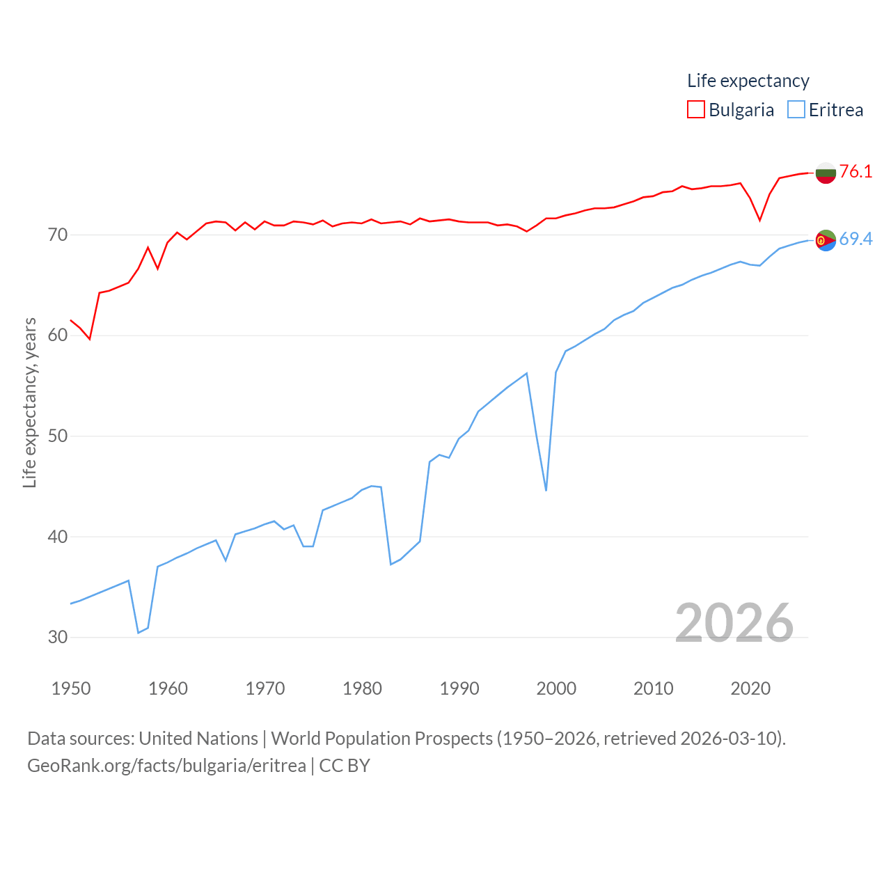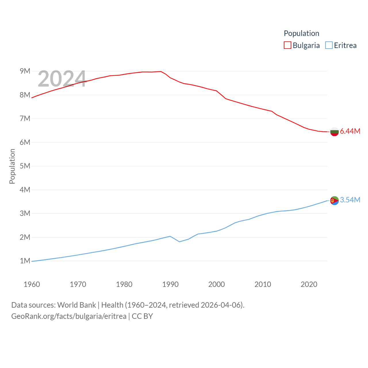 Bulgaria has a population of 6.44M (ranked 110/197), compared with 3.54M in Eritrea (ranked 131/197). Bulgaria's land area is 41,915 sq mi versus 46,787 sq mi for Eritrea (ranked 101st vs. 96th).