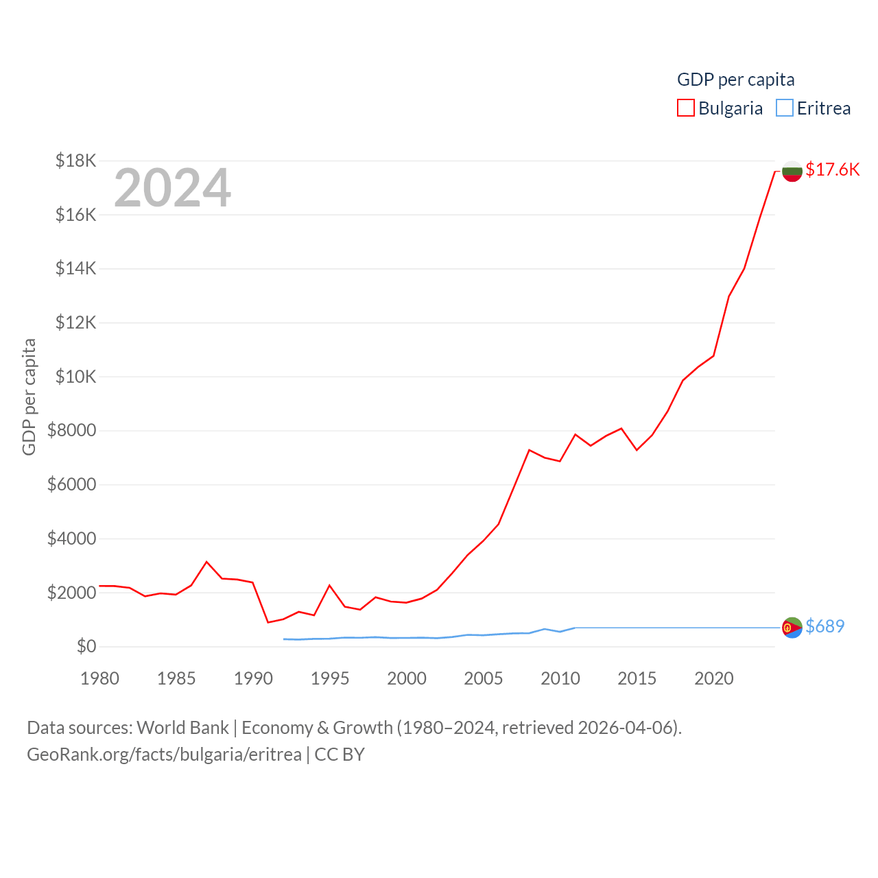 By GDP, Bulgaria ranks 67/197 ($113B) and Eritrea ranks 179/197 ($2.07B). By GDP per capita, Bulgaria ranks 64/197 ($17,596), while Eritrea ranks 188/197 ($689).