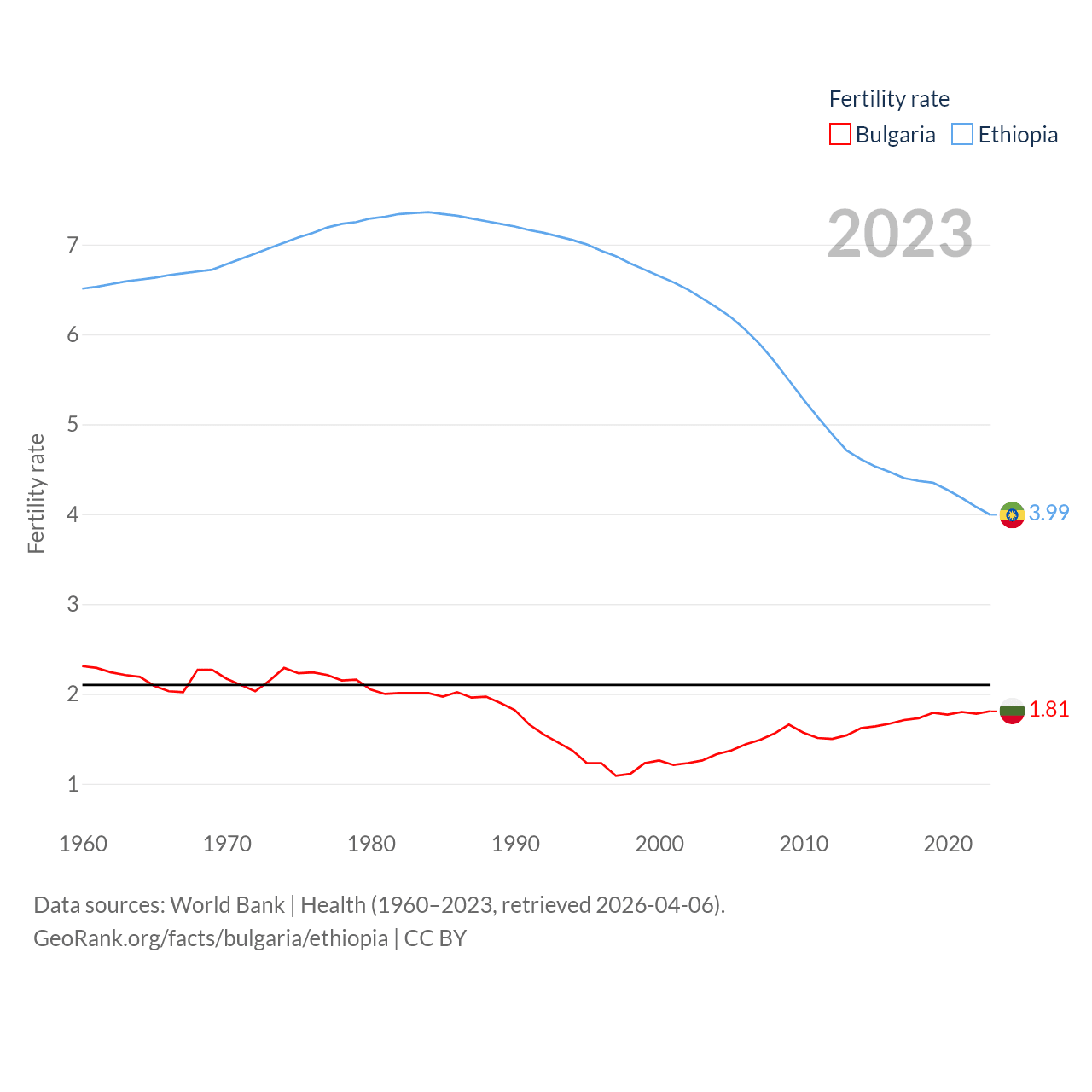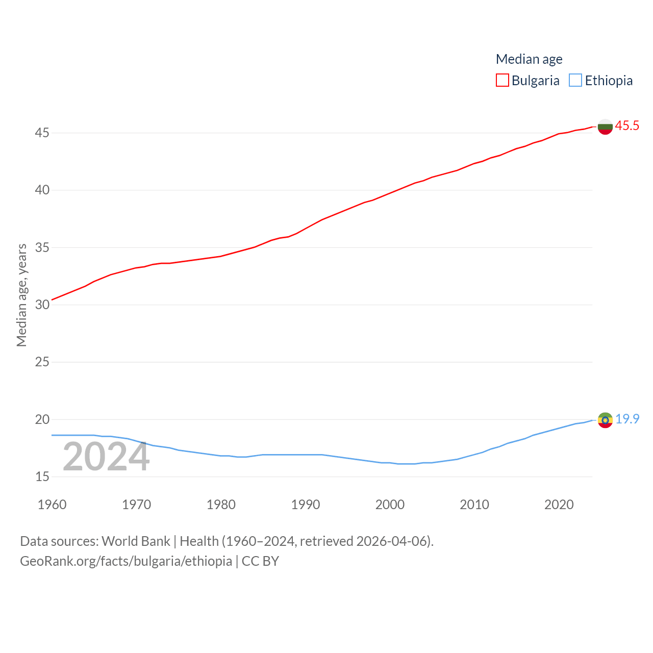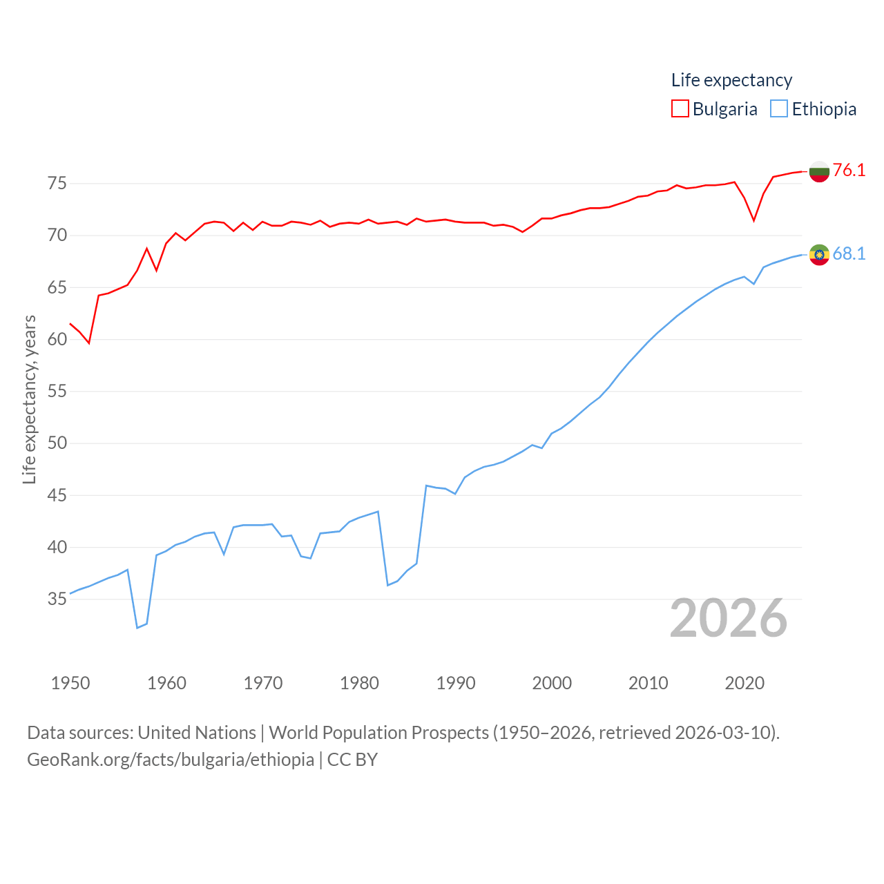 Bulgaria has a population of 6.44M (ranked 110/197), compared with 132M in Ethiopia (ranked 10/197). Bulgaria's land area is 41,915 sq mi versus 435,716 sq mi for Ethiopia (ranked 101st vs. 25th).