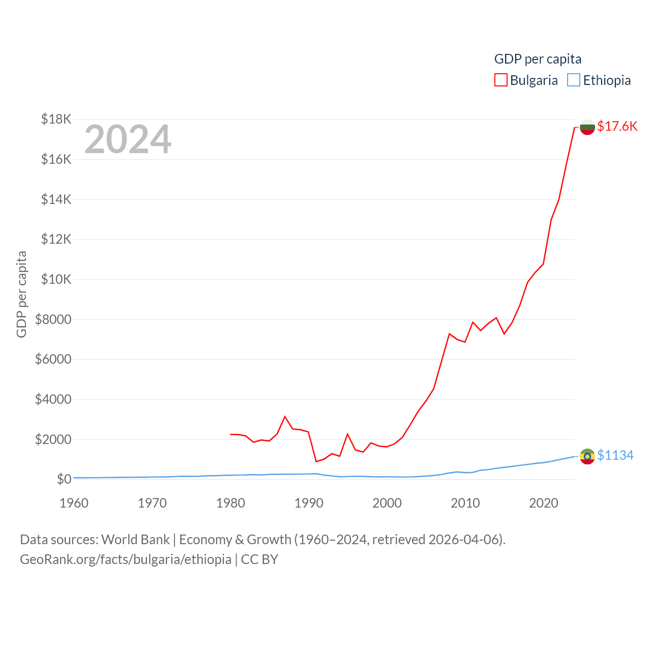 By GDP, Bulgaria ranks 67/197 ($113B) and Ethiopia ranks 60/197 ($150B). By GDP per capita, Bulgaria ranks 64/197 ($17,596), while Ethiopia ranks 171/197 ($1,134).
