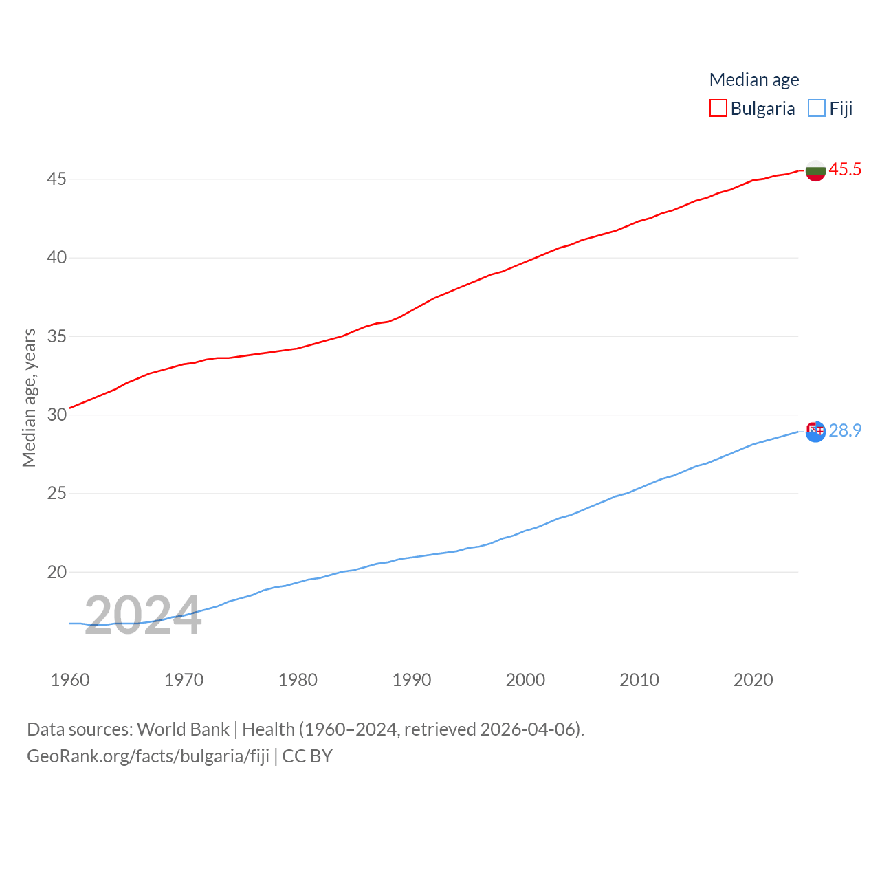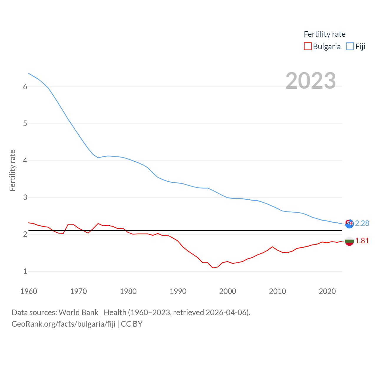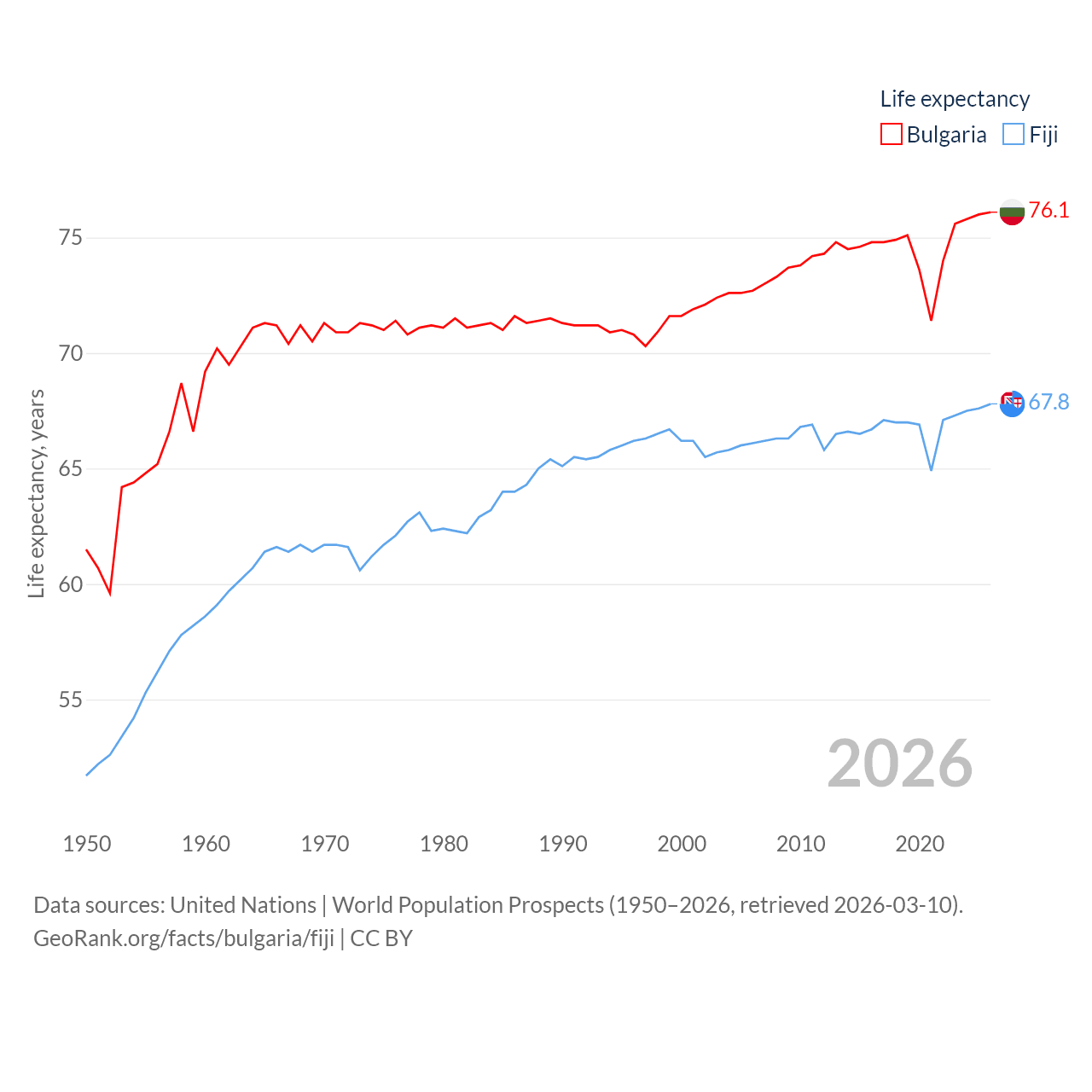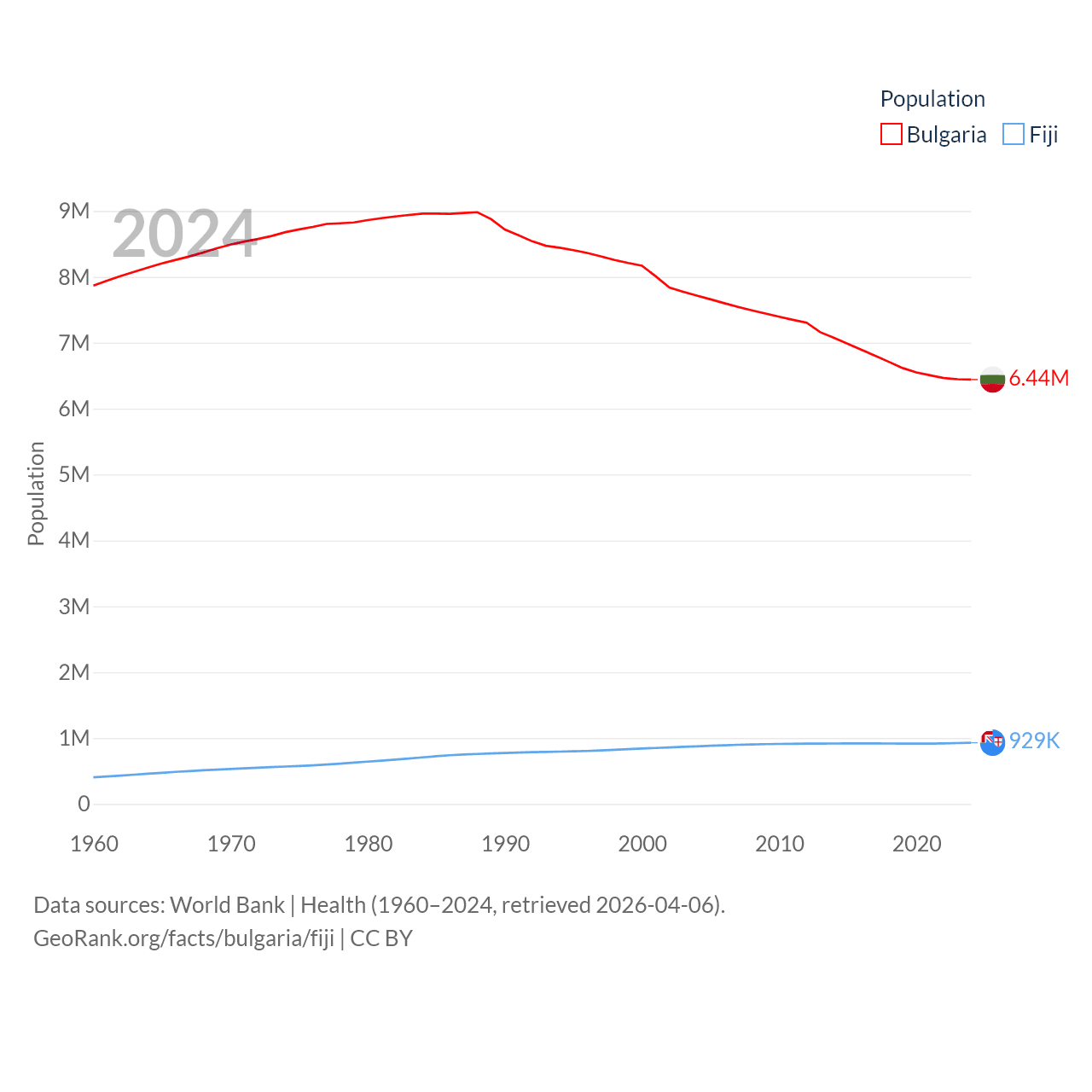 Bulgaria has a population of 6.44M (ranked 110/197), compared with 929K in Fiji (ranked 159/197). Bulgaria's land area is 41,915 sq mi versus 7,054 sq mi for Fiji (ranked 101st vs. 152nd).
