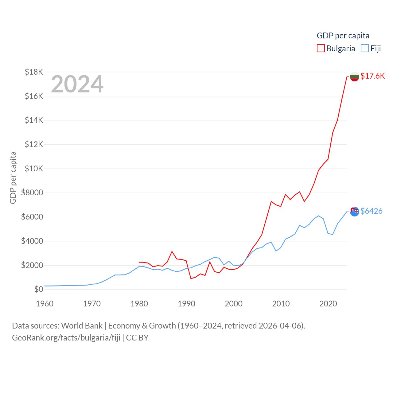 By GDP, Bulgaria ranks 67/197 ($113B) and Fiji ranks 161/197 ($5.97B). By GDP per capita, Bulgaria ranks 64/197 ($17,596), while Fiji ranks 108/197 ($6,426).