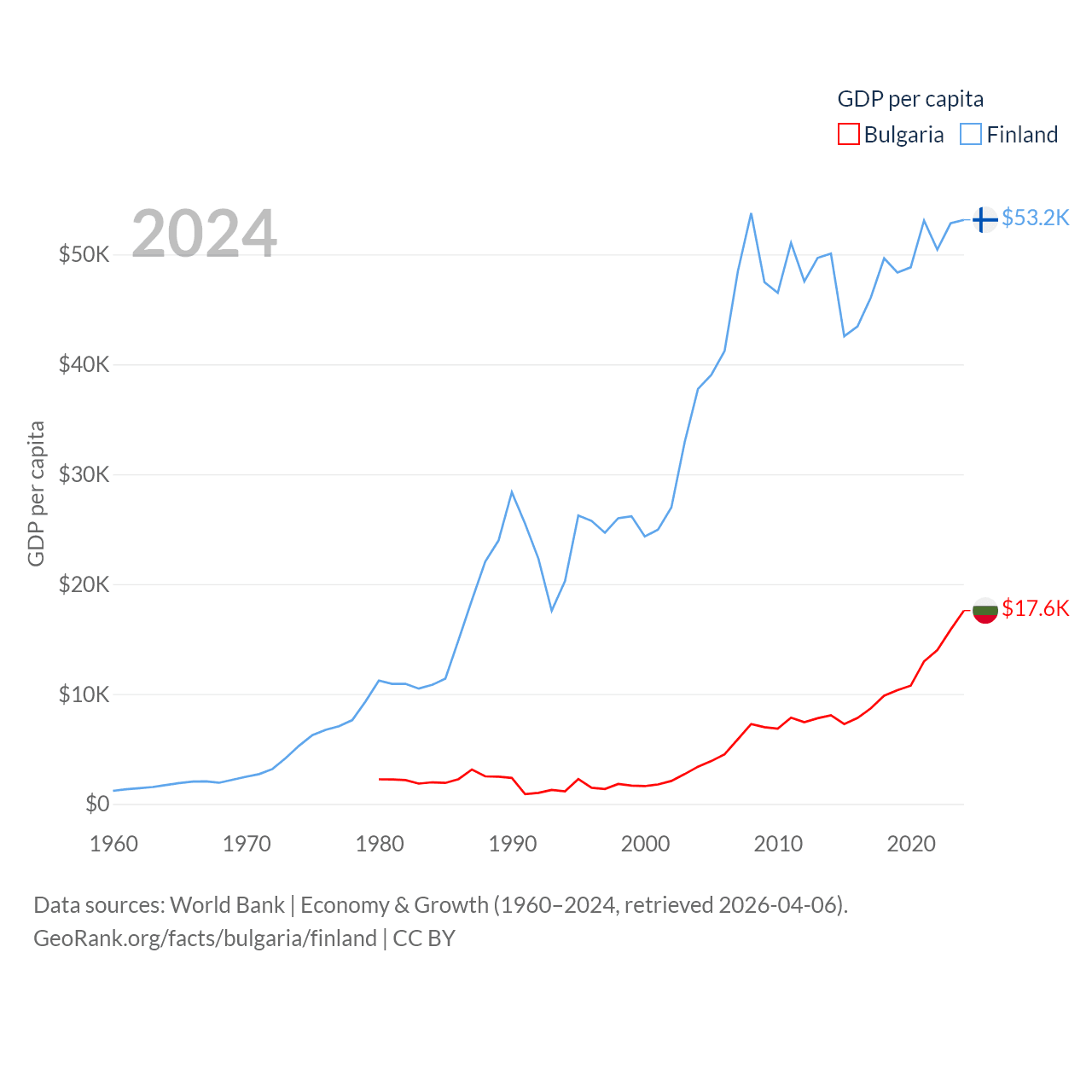 By GDP, Bulgaria ranks 67/197 ($113B) and Finland ranks 47/197 ($299B). By GDP per capita, Bulgaria ranks 64/197 ($17,596), while Finland ranks 23/197 ($53,150).