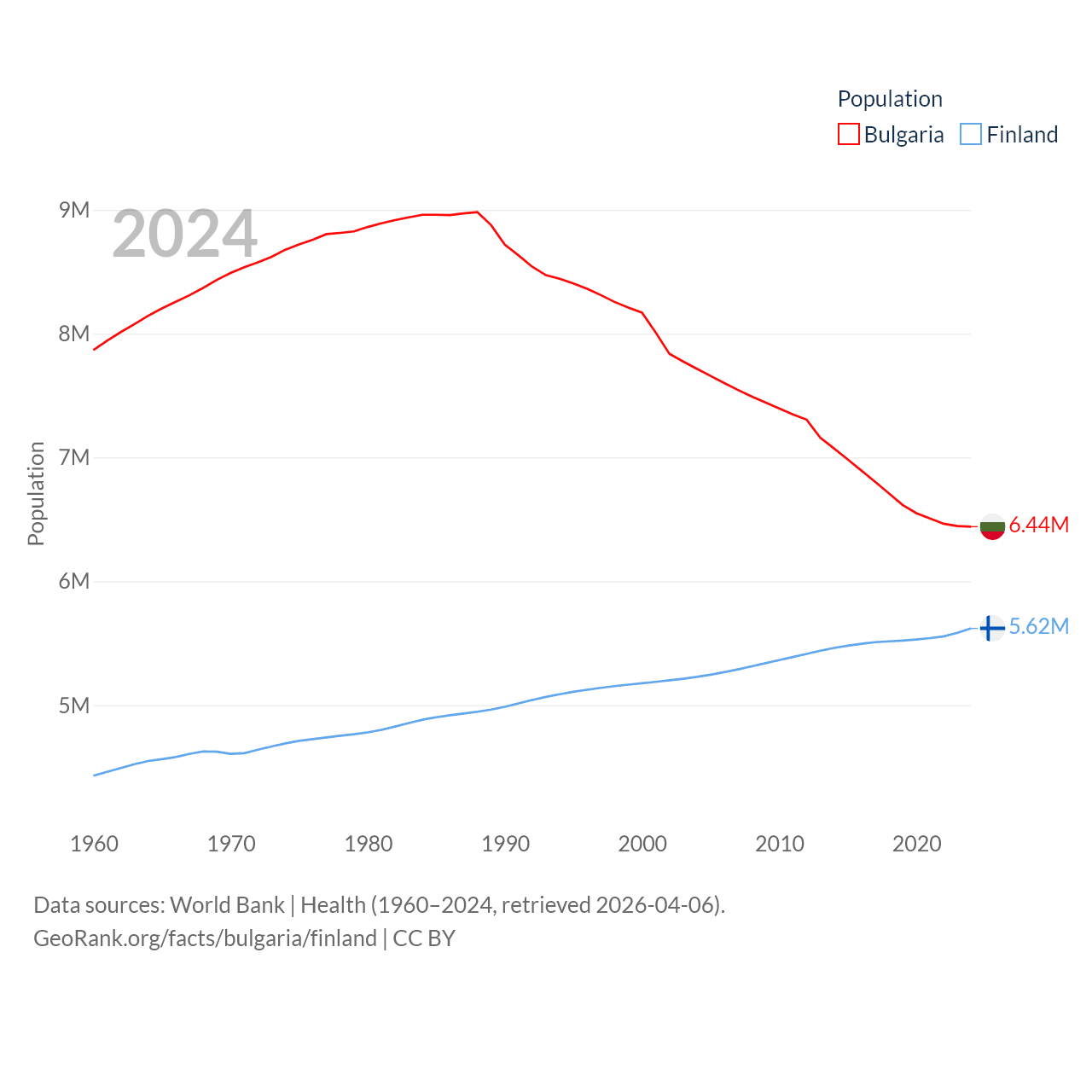 Bulgaria has a population of 6.44M (ranked 110/197), compared with 5.62M in Finland (ranked 116/197). Bulgaria's land area is 41,915 sq mi versus 117,360 sq mi for Finland (ranked 101st vs. 70th).