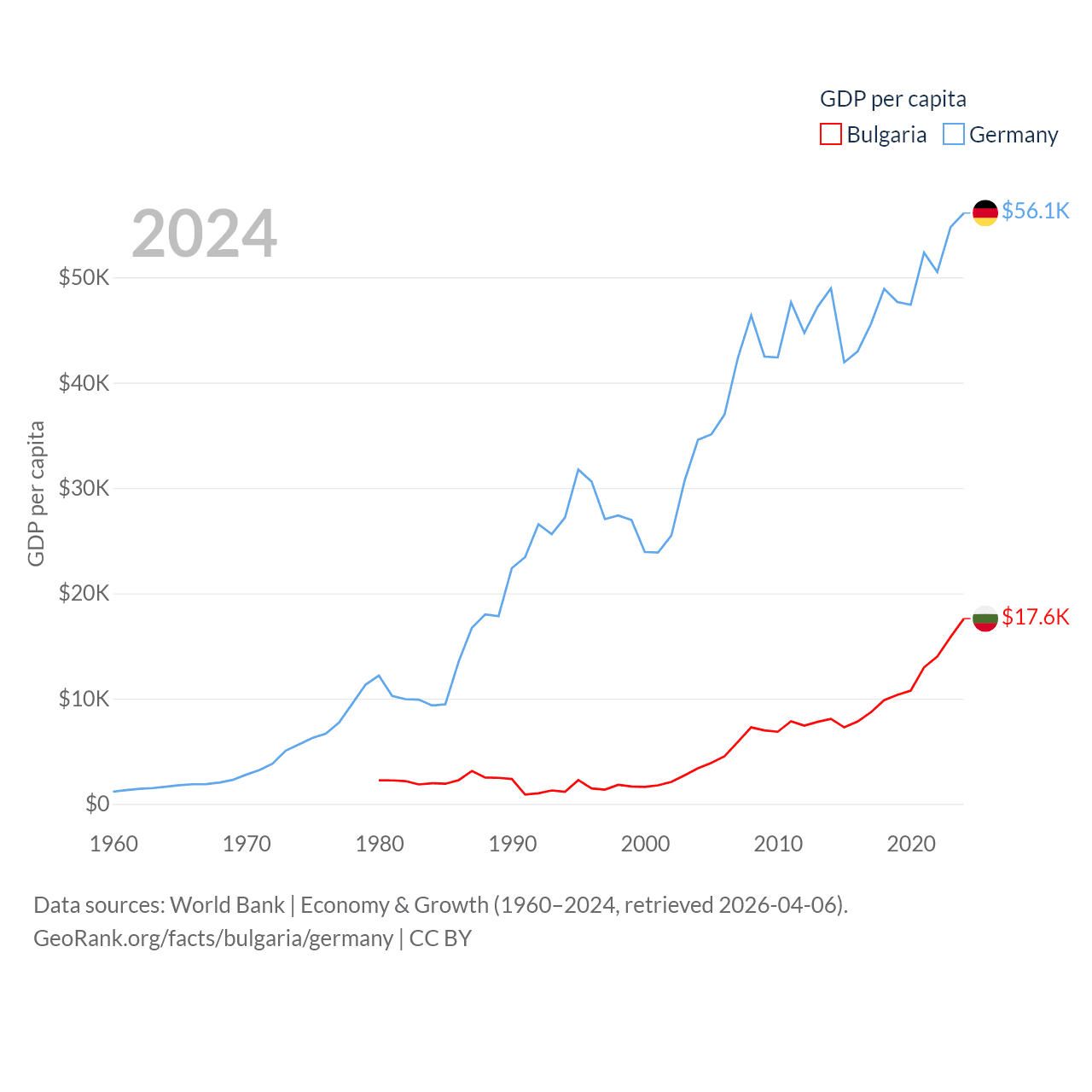 By GDP, Bulgaria ranks 67/197 ($113B) and Germany ranks 3/197 ($4.69T). By GDP per capita, Bulgaria ranks 64/197 ($17,596), while Germany ranks 19/197 ($56,104).