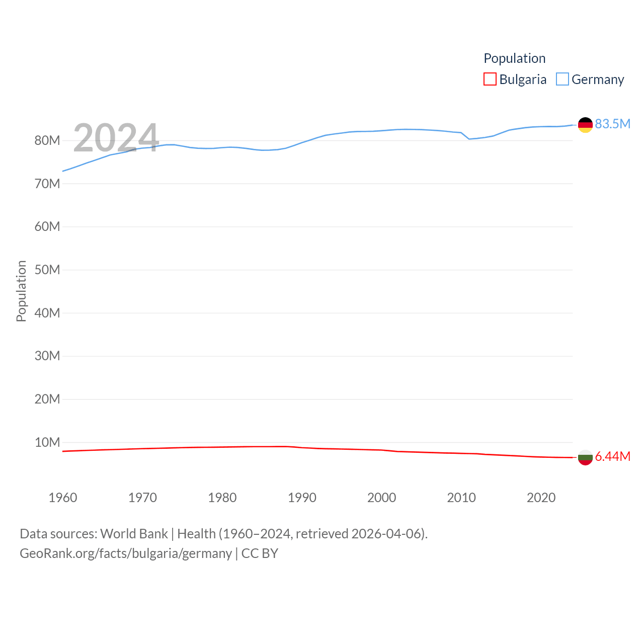 Bulgaria has a population of 6.44M (ranked 110/197), compared with 83.5M in Germany (ranked 19/197). Bulgaria's land area is 41,915 sq mi versus 134,916 sq mi for Germany (ranked 101st vs. 63rd).