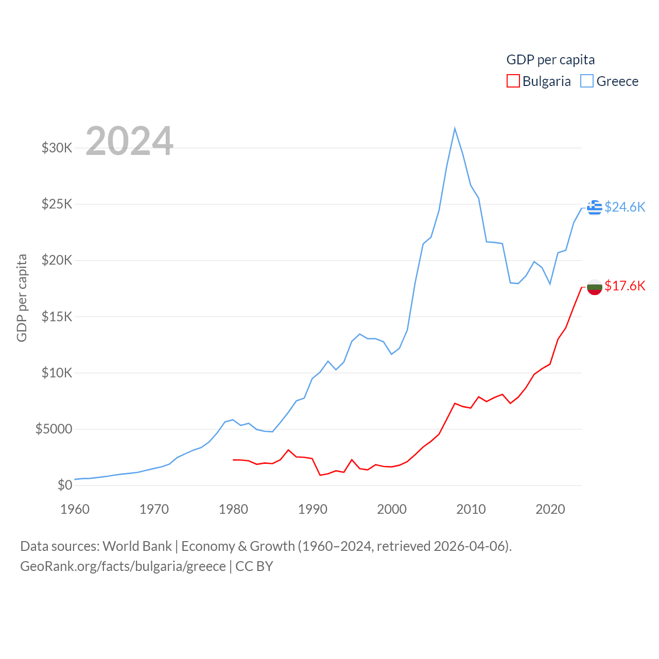By GDP, Bulgaria ranks 67/197 ($113B) and Greece ranks 53/197 ($256B). By GDP per capita, Bulgaria ranks 64/197 ($17,596), while Greece ranks 49/197 ($24,626).