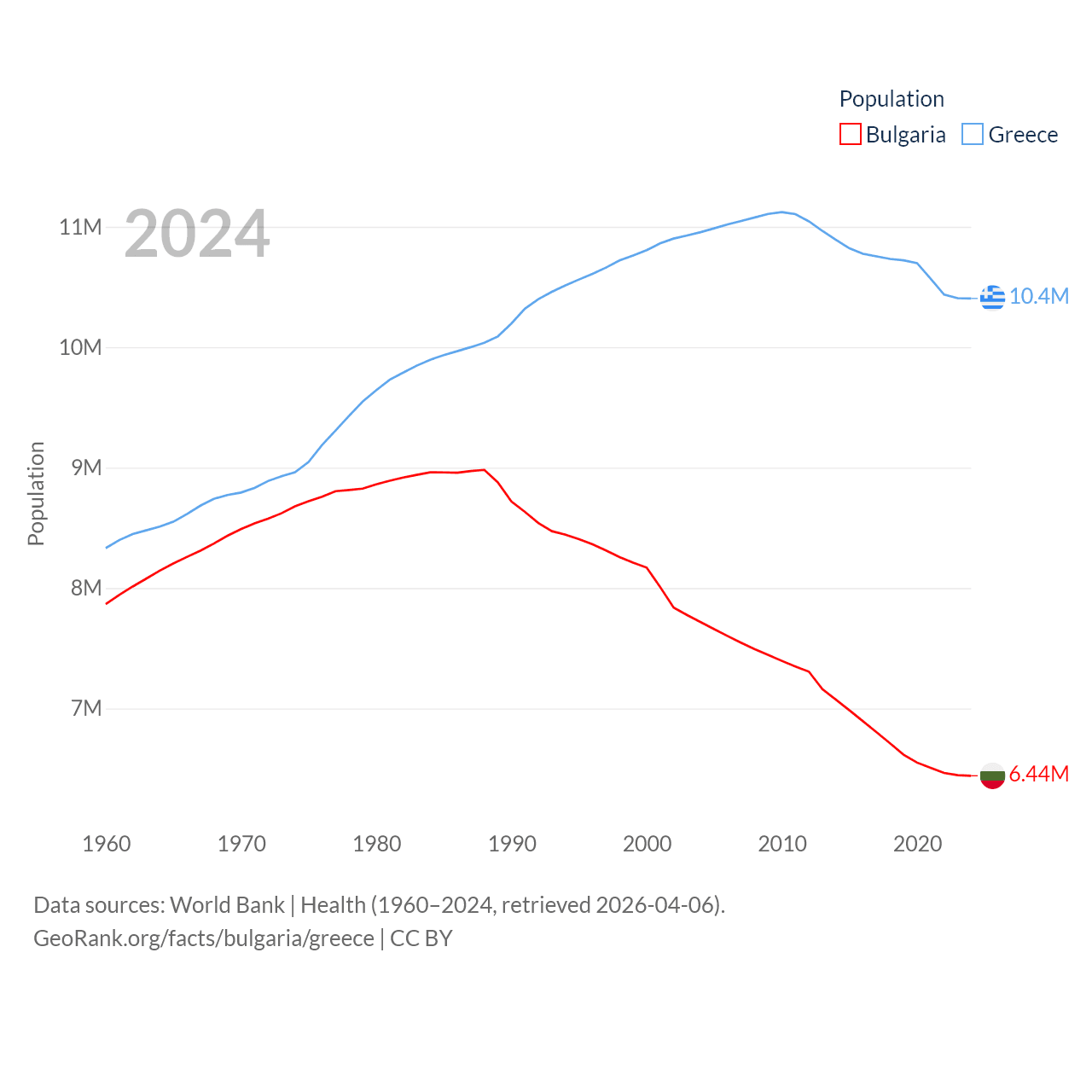 Bulgaria has a population of 6.44M (ranked 110/197), compared with 10.4M in Greece (ranked 94/197). Bulgaria's land area is 41,915 sq mi versus 49,769 sq mi for Greece (ranked 101st vs. 95th).