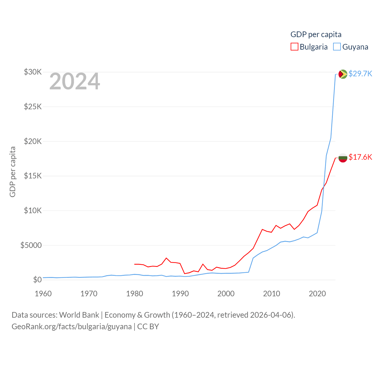 By GDP, Bulgaria ranks 67/197 ($113B) and Guyana ranks 120/197 ($24.7B). By GDP per capita, Bulgaria ranks 64/197 ($17,596), while Guyana ranks 41/197 ($29,675).