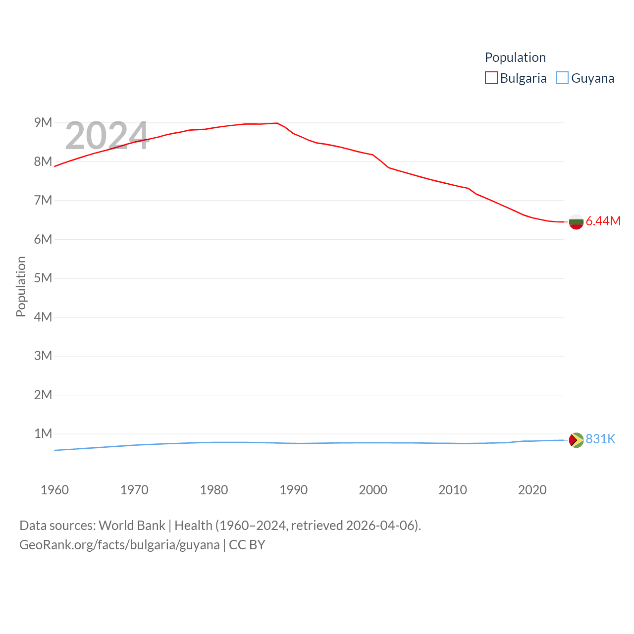 Bulgaria has a population of 6.44M (ranked 110/197), compared with 831K in Guyana (ranked 161/197). Bulgaria's land area is 41,915 sq mi versus 81,522 sq mi for Guyana (ranked 101st vs. 82nd).