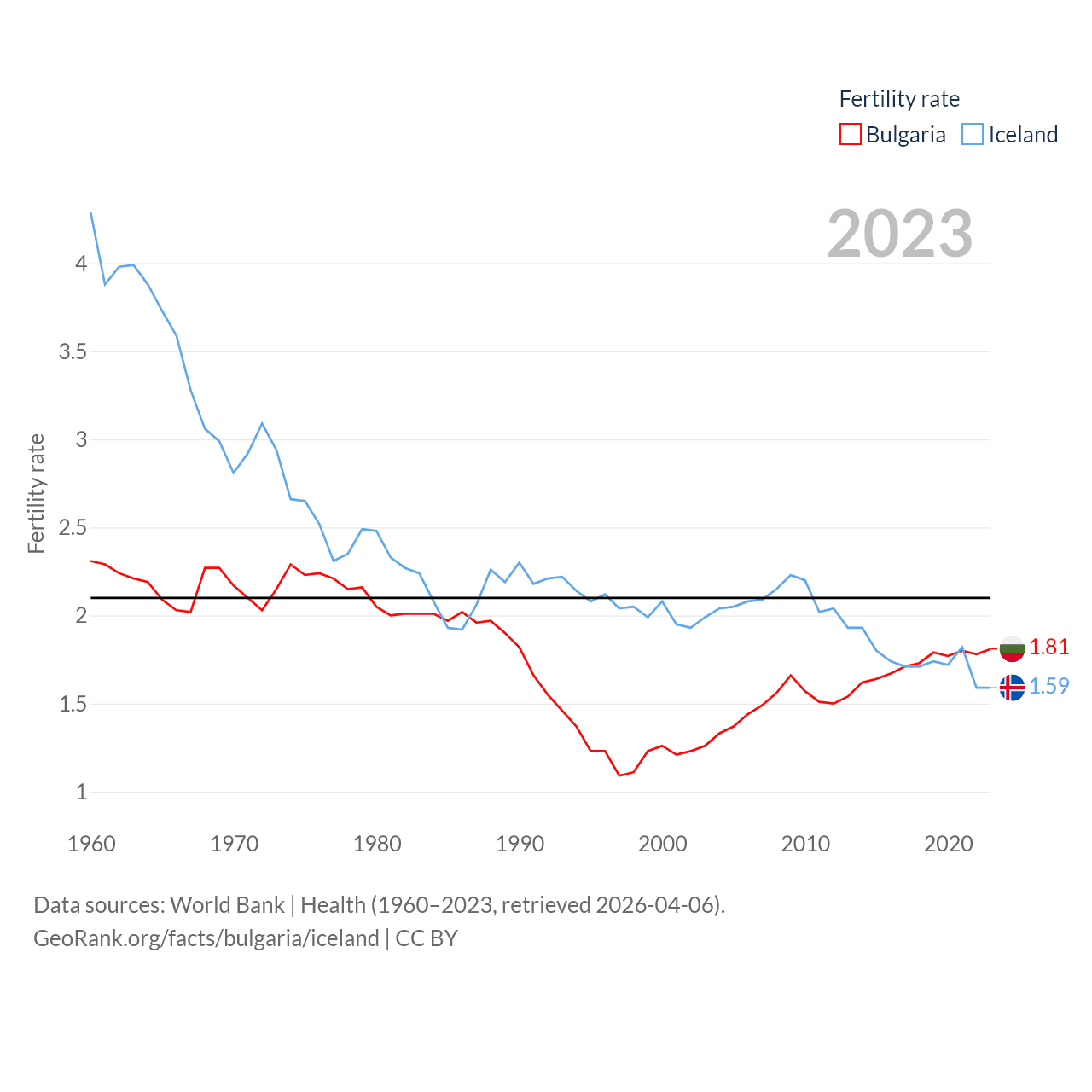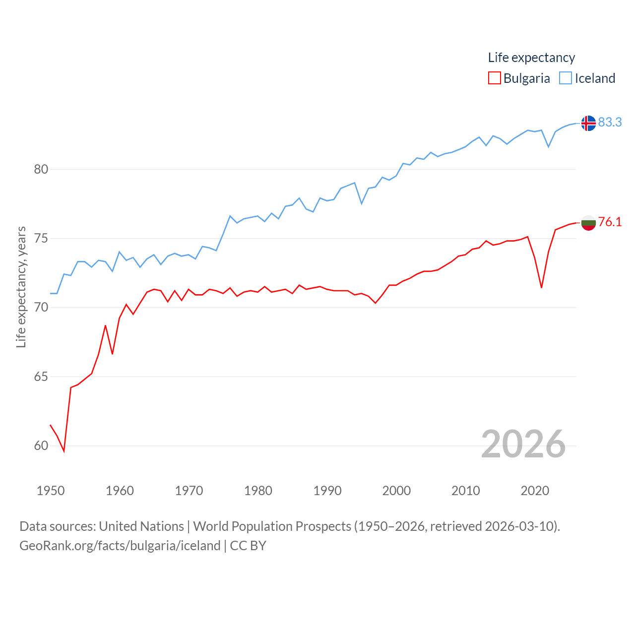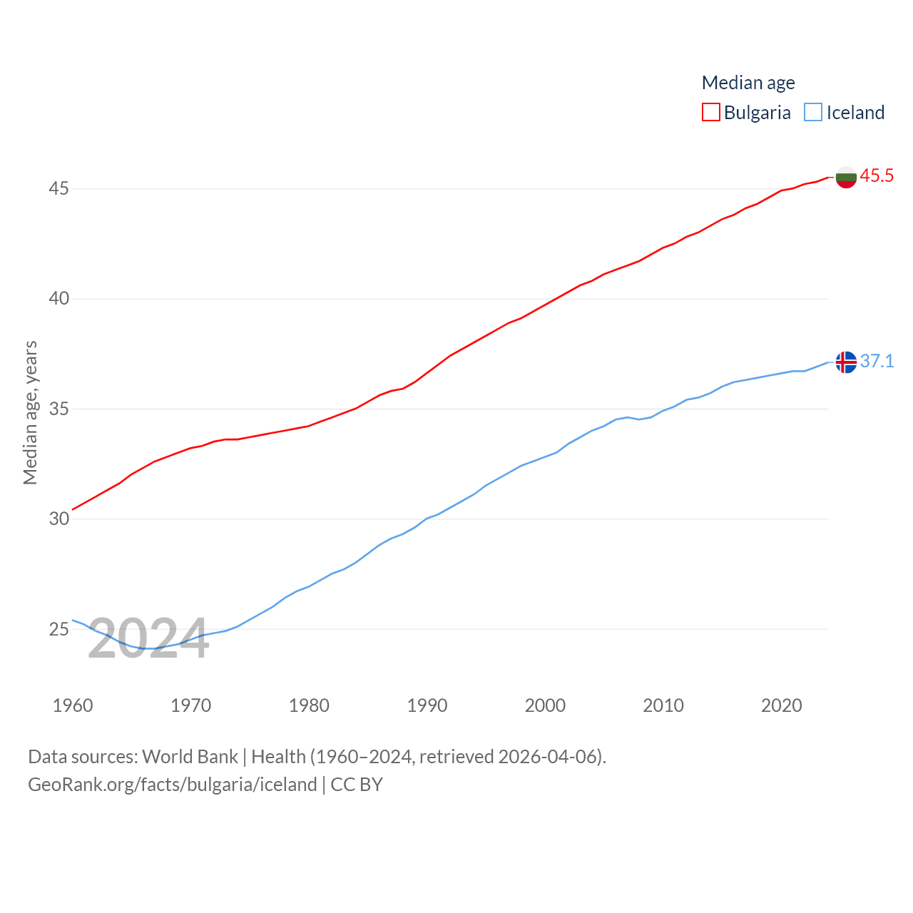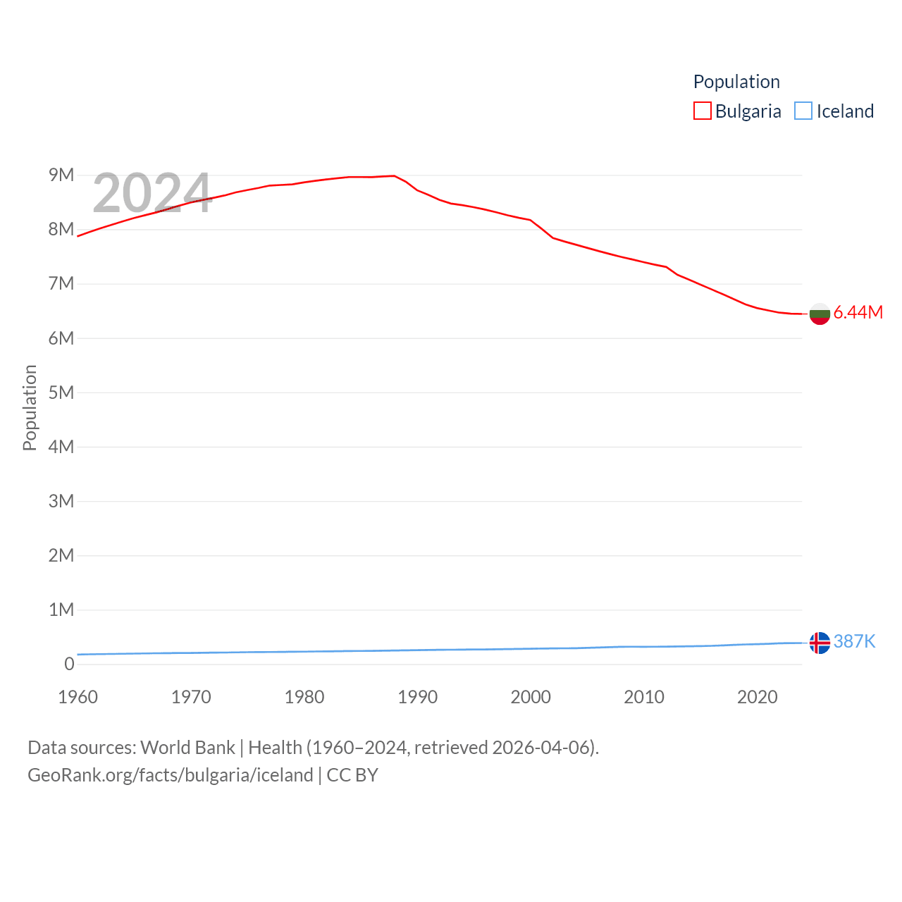 Bulgaria has a population of 6.44M (ranked 110/197), compared with 387K in Iceland (ranked 173/197). Bulgaria's land area is 41,915 sq mi versus 38,931 sq mi for Iceland (ranked 101st vs. 104th).