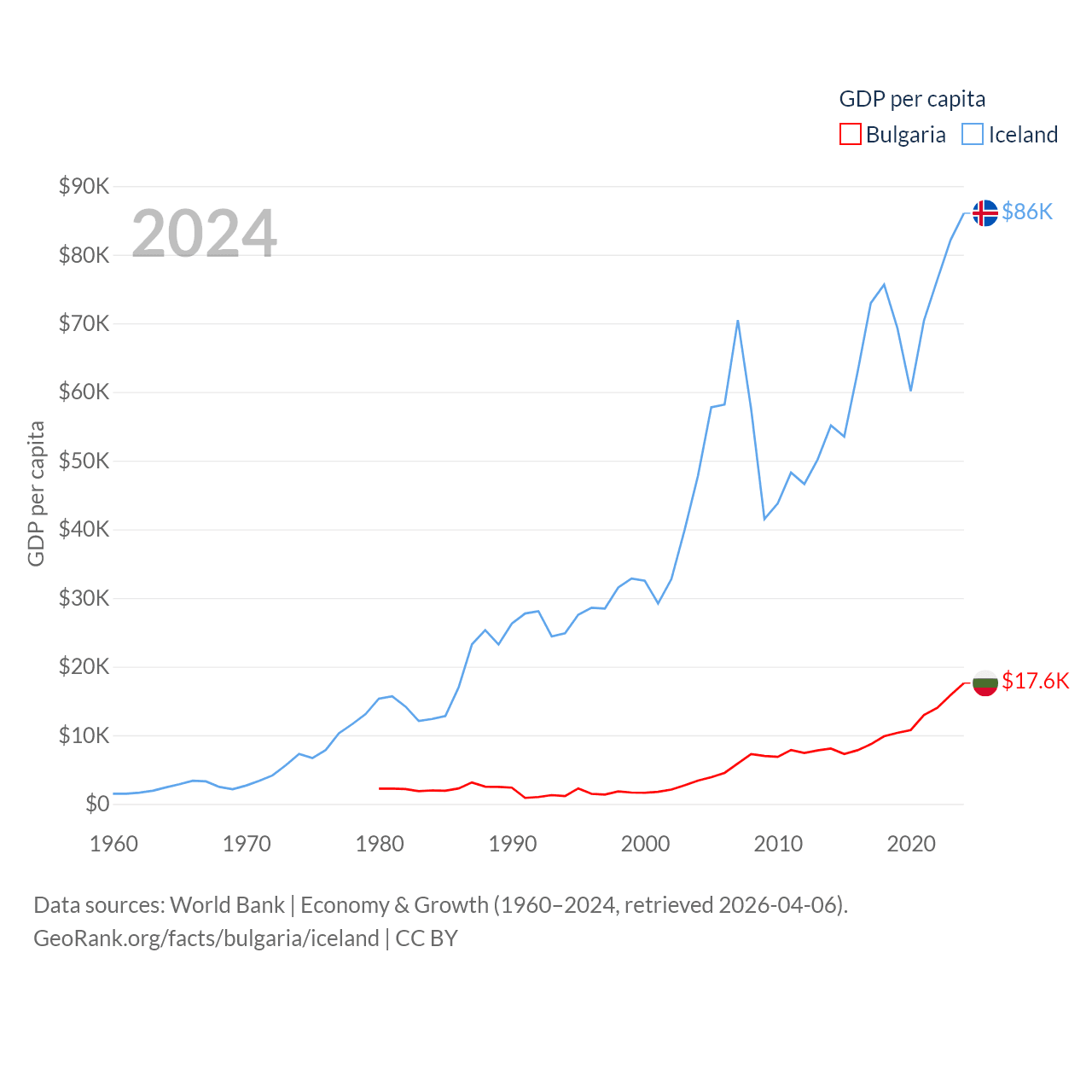 By GDP, Bulgaria ranks 67/197 ($113B) and Iceland ranks 108/197 ($33.3B). By GDP per capita, Bulgaria ranks 64/197 ($17,596), while Iceland ranks 9/197 ($86,041).