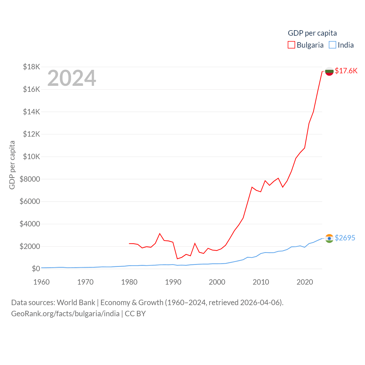 By GDP, Bulgaria ranks 67/197 ($113B) and India ranks 5/197 ($3.91T). By GDP per capita, Bulgaria ranks 64/197 ($17,596), while India ranks 143/197 ($2,695).
