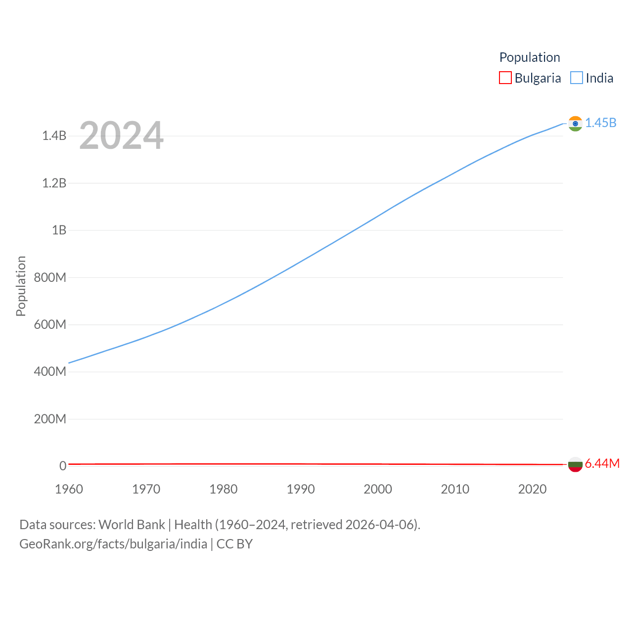 Bulgaria has a population of 6.44M (ranked 110/197), compared with 1.45B in India (ranked 1/197). Bulgaria's land area is 41,915 sq mi versus 1,147,955 sq mi for India (ranked 101st vs. 7th).