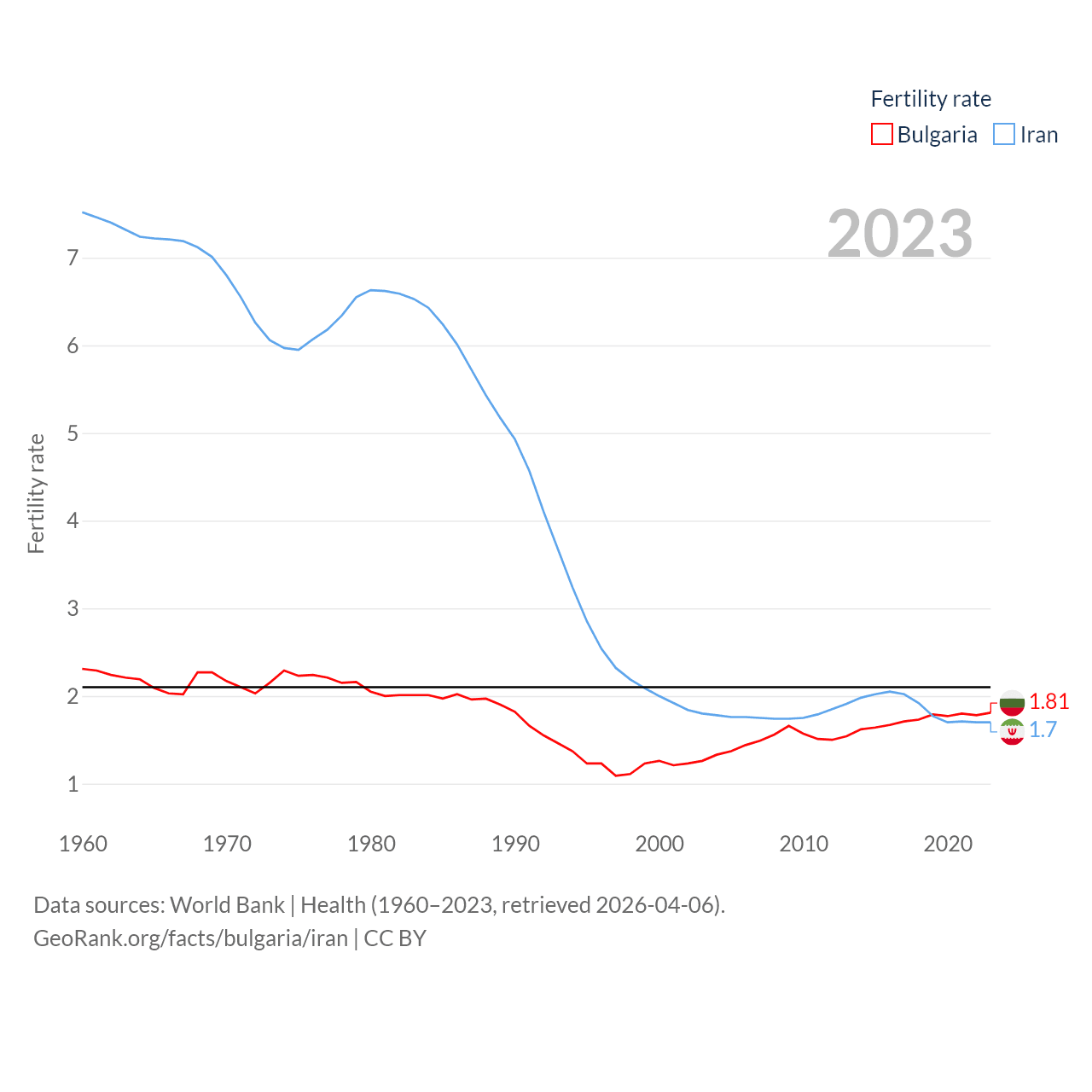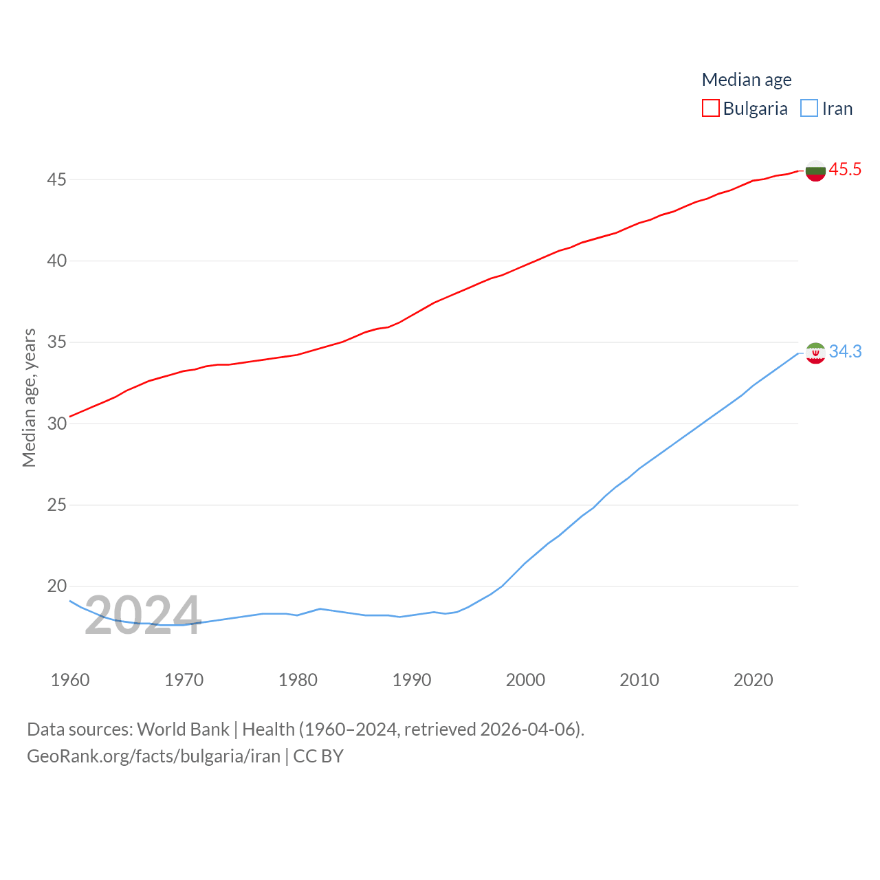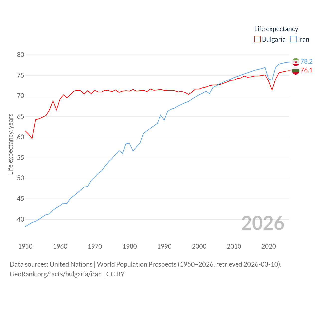 Bulgaria has a population of 6.44M (ranked 110/197), compared with 91.6M in Iran (ranked 17/197). Bulgaria's land area is 41,915 sq mi versus 626,451 sq mi for Iran (ranked 101st vs. 17th).