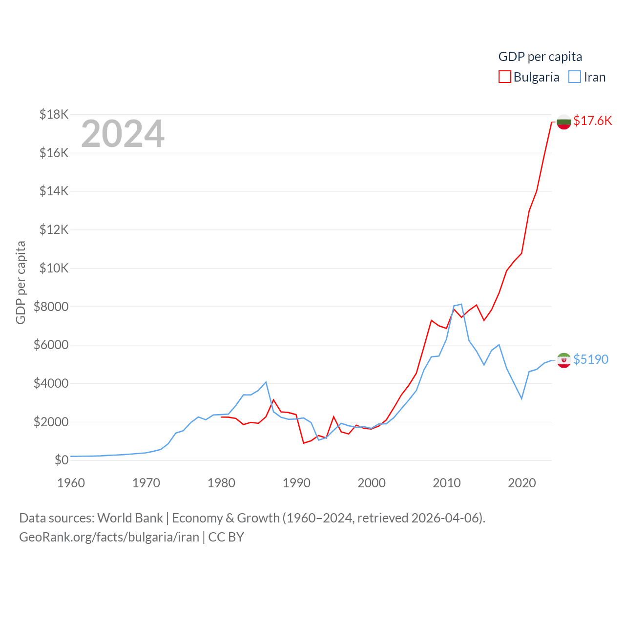By GDP, Bulgaria ranks 67/197 ($113B) and Iran ranks 34/197 ($475B). By GDP per capita, Bulgaria ranks 64/197 ($17,596), while Iran ranks 119/197 ($5,190).