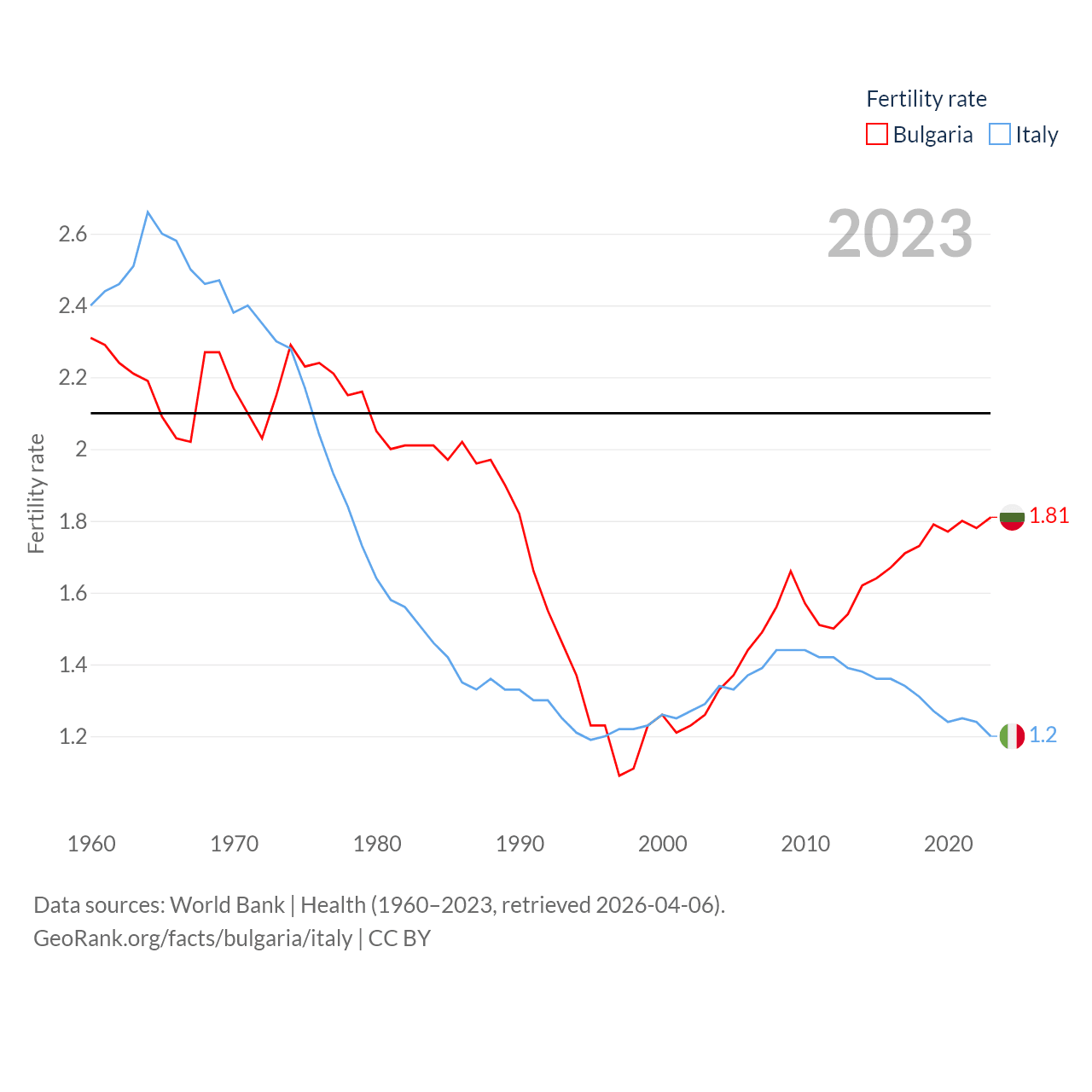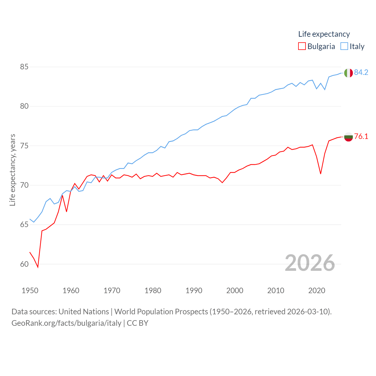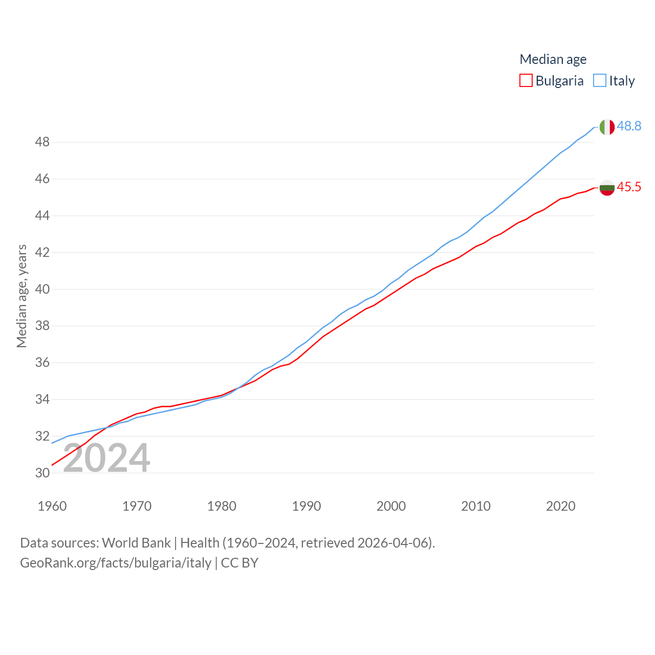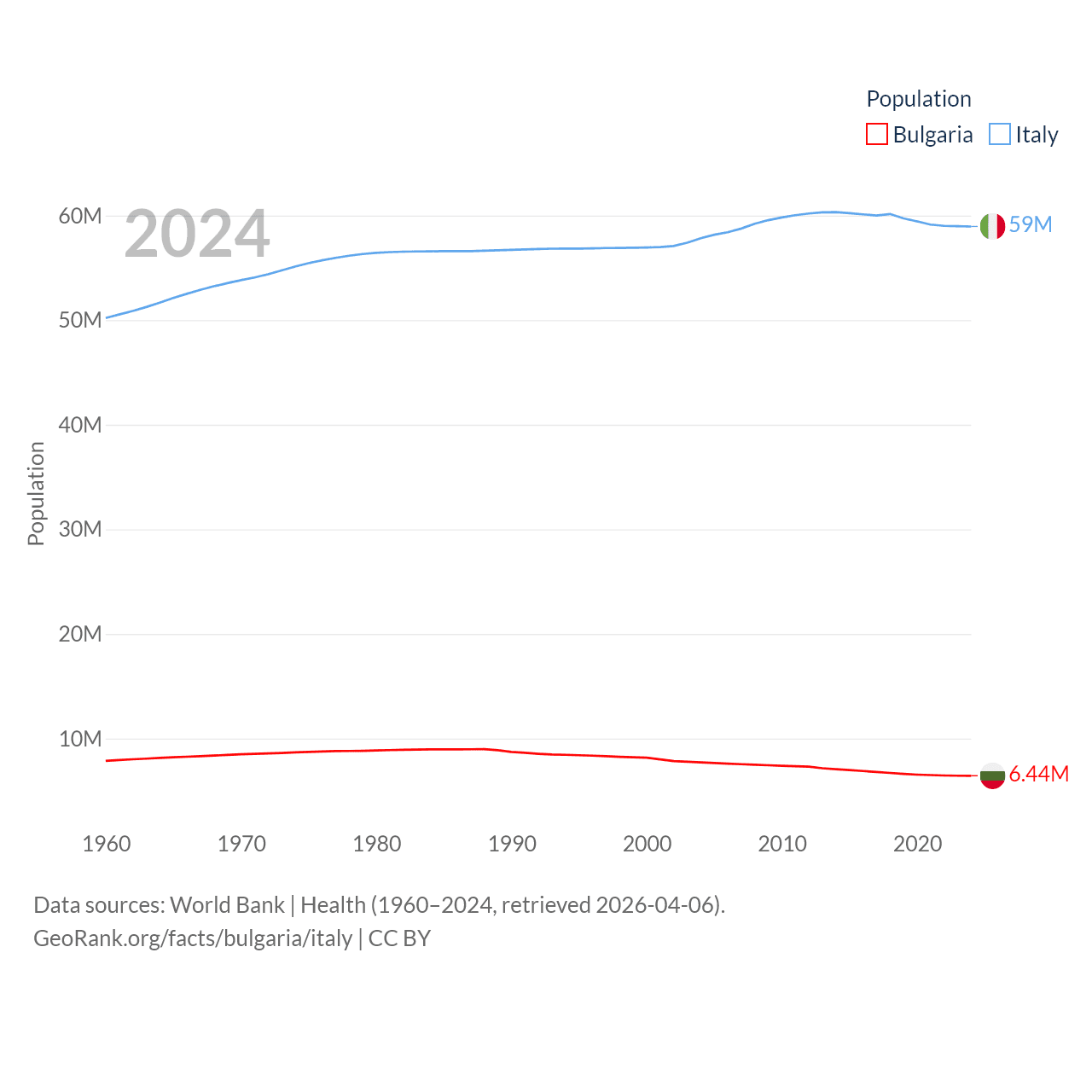 Bulgaria has a population of 6.44M (ranked 110/197), compared with 59M in Italy (ranked 25/197). Bulgaria's land area is 41,915 sq mi versus 114,178 sq mi for Italy (ranked 101st vs. 72nd).
