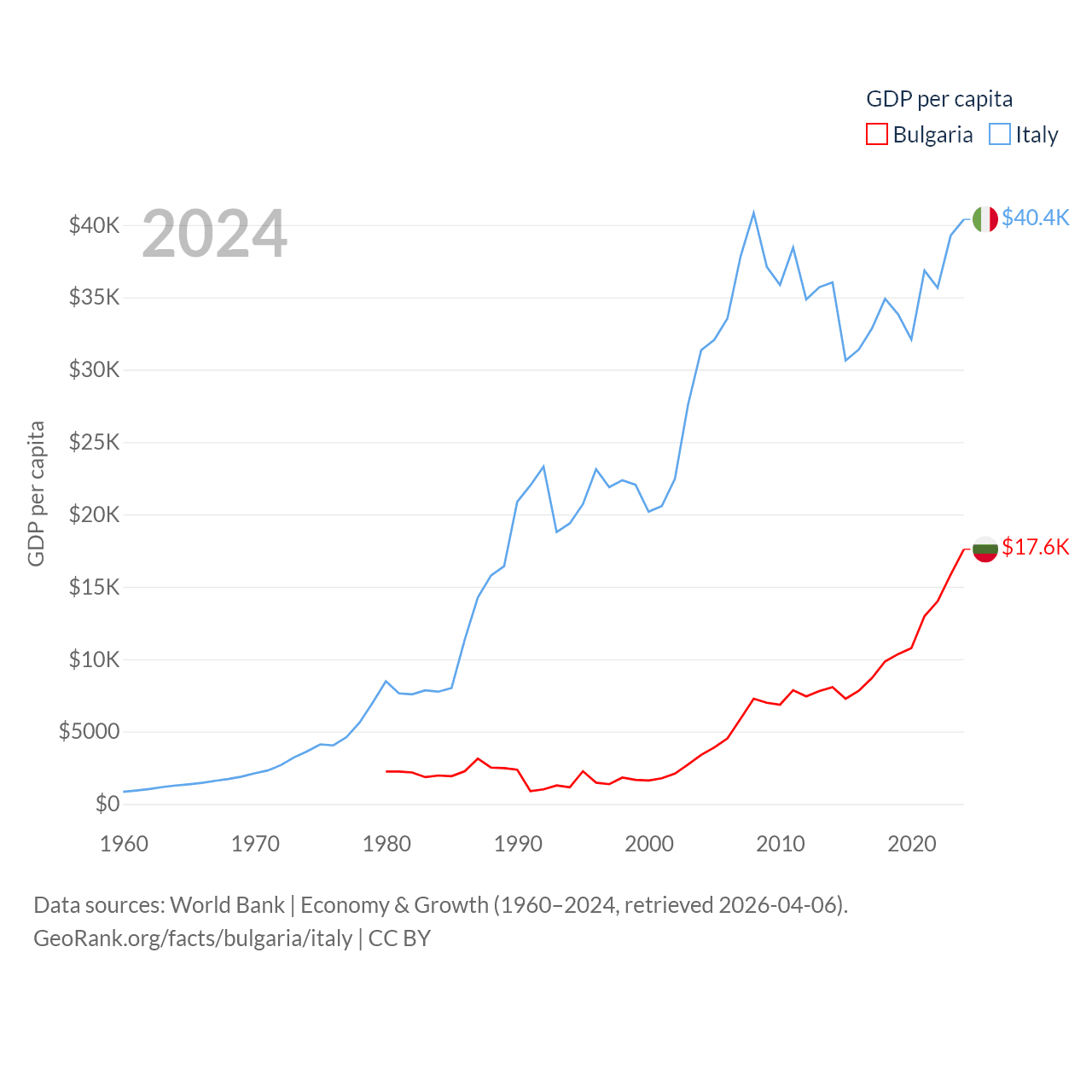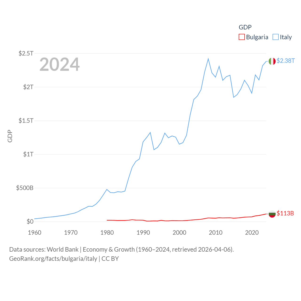 By GDP, Bulgaria ranks 67/197 ($113B) and Italy ranks 8/197 ($2.38T). By GDP per capita, Bulgaria ranks 64/197 ($17,596), while Italy ranks 29/197 ($40,385).
