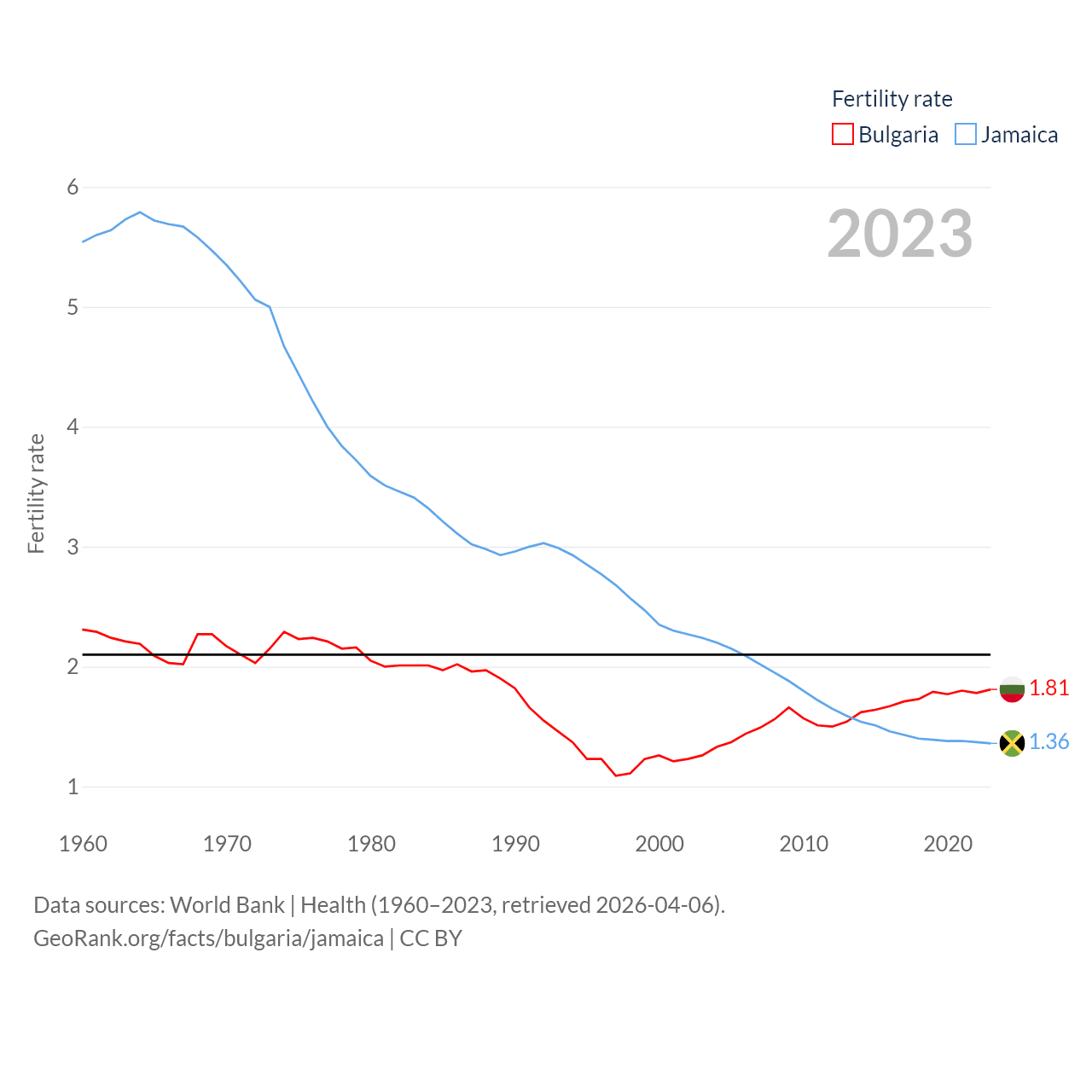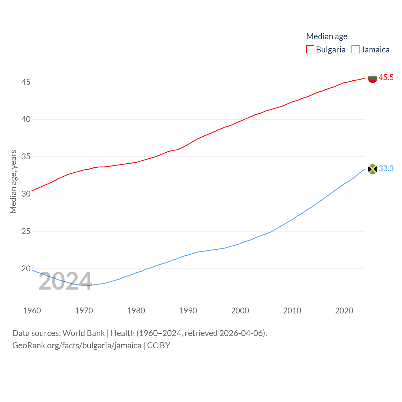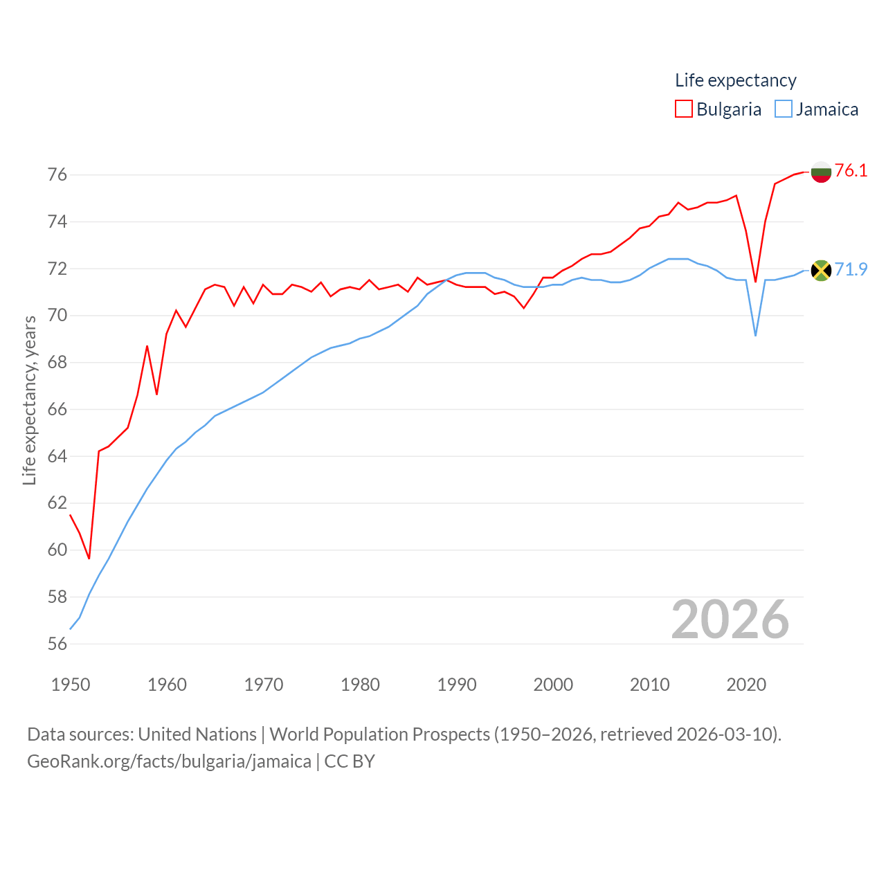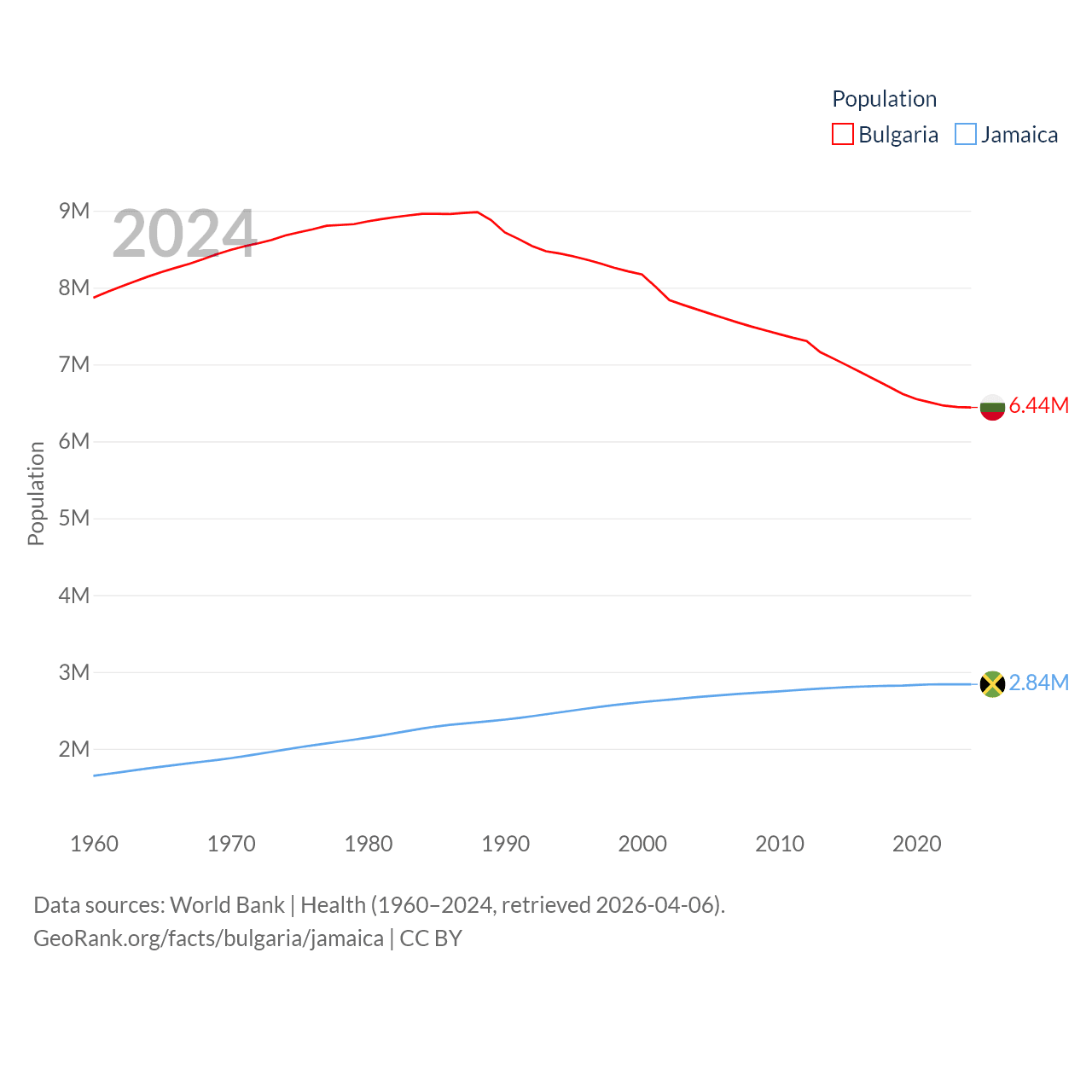 Bulgaria has a population of 6.44M (ranked 110/197), compared with 2.84M in Jamaica (ranked 139/197). Bulgaria's land area is 41,915 sq mi versus 4,181 sq mi for Jamaica (ranked 101st vs. 159th).
