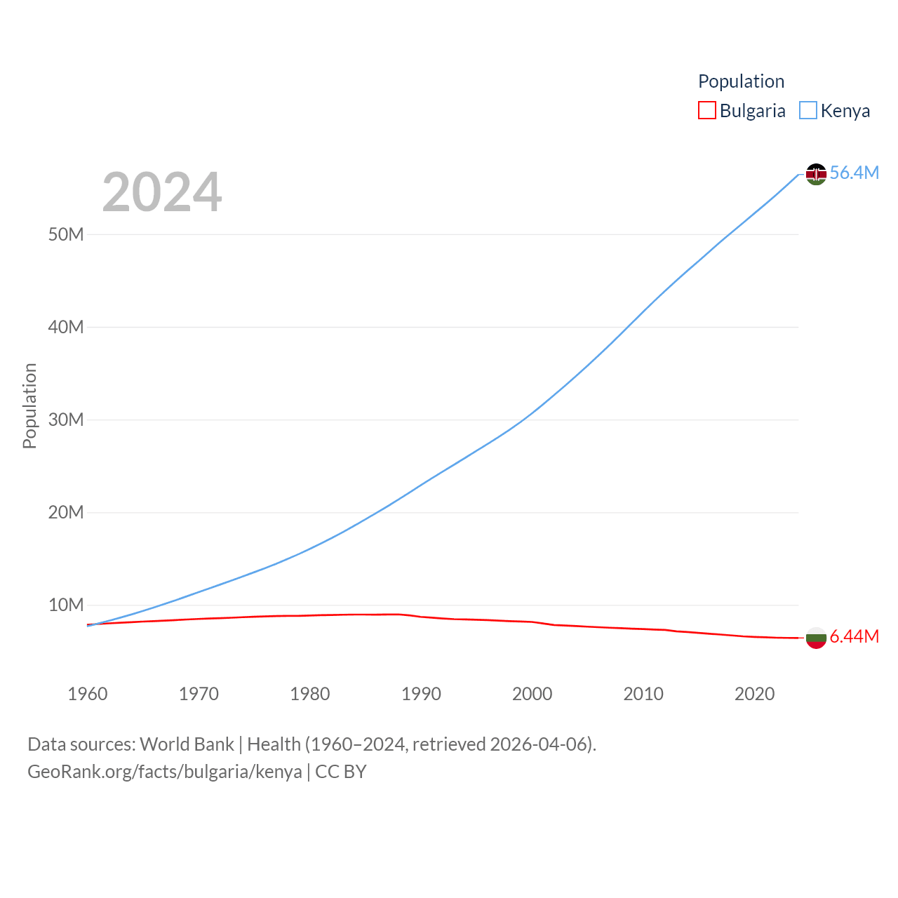 Bulgaria has a population of 6.44M (ranked 110/197), compared with 56.4M in Kenya (ranked 26/197). Bulgaria's land area is 41,915 sq mi versus 224,278 sq mi for Kenya (ranked 101st vs. 45th).