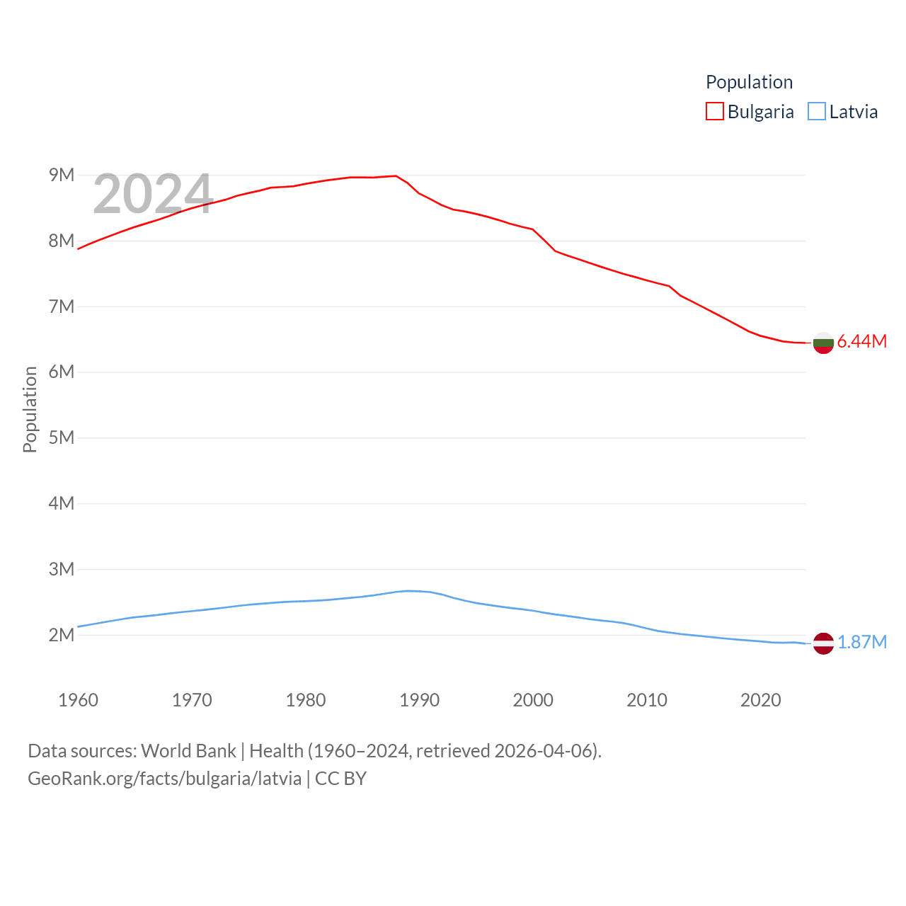 Bulgaria has a population of 6.44M (ranked 110/197), compared with 1.87M in Latvia (ranked 149/197). Bulgaria's land area is 41,915 sq mi versus 24,027 sq mi for Latvia (ranked 101st vs. 121st).