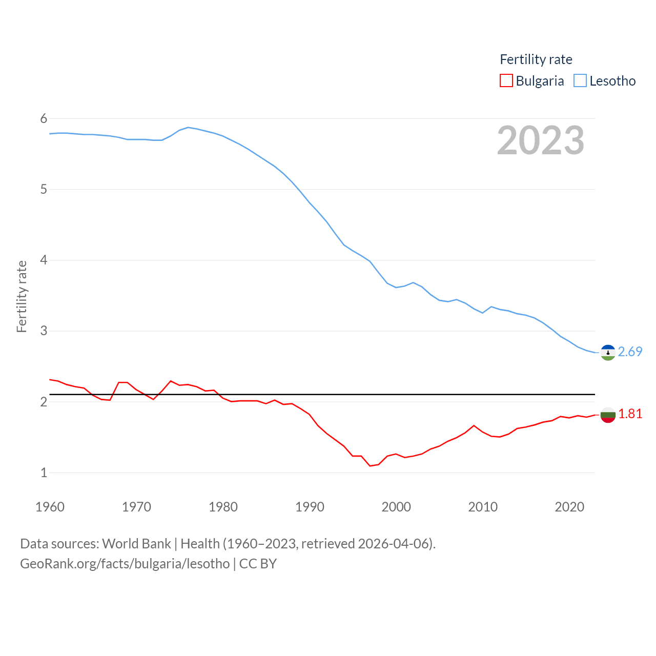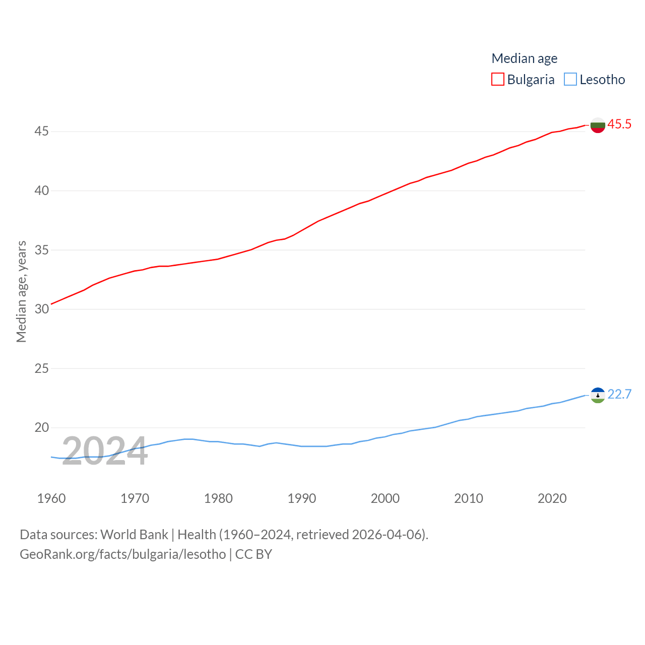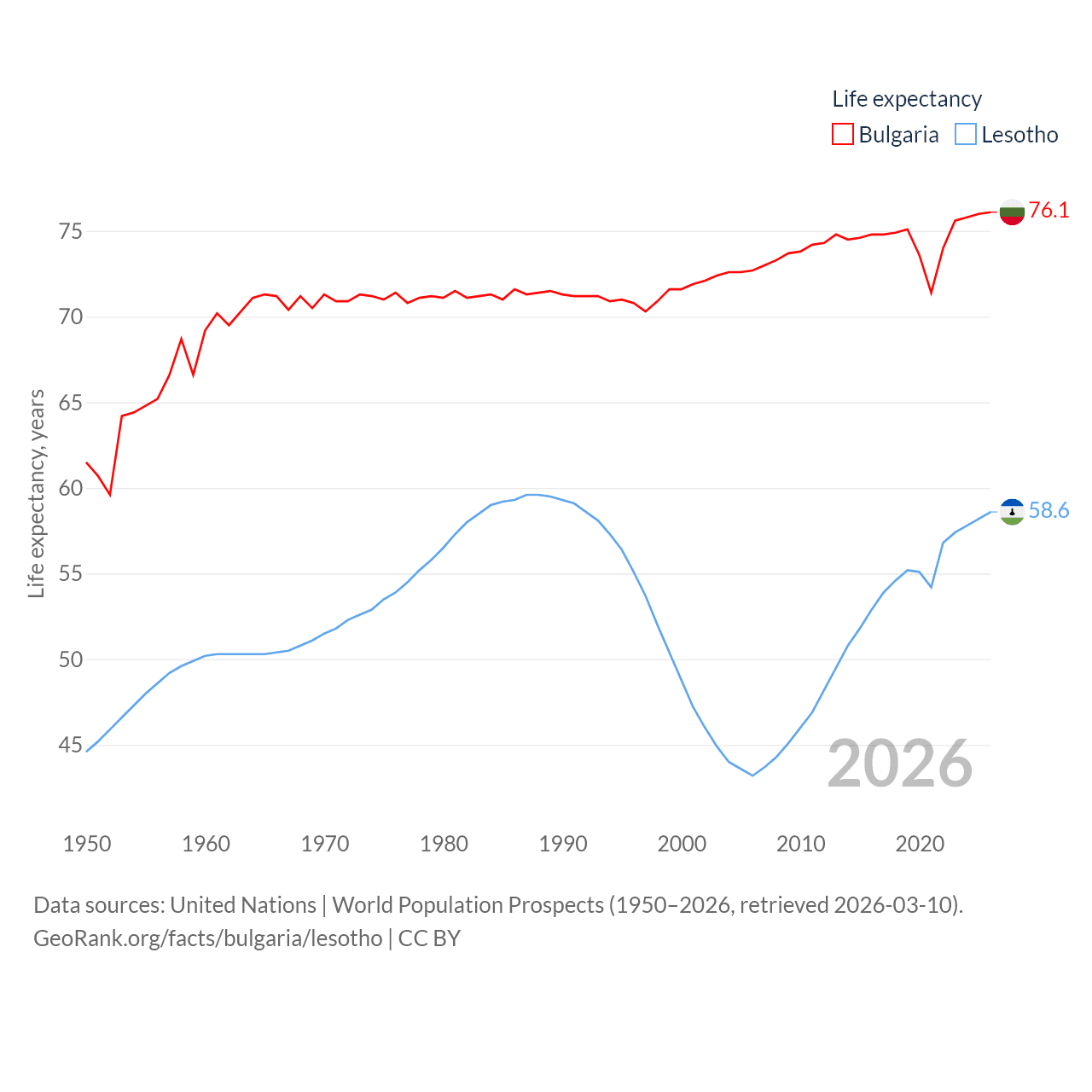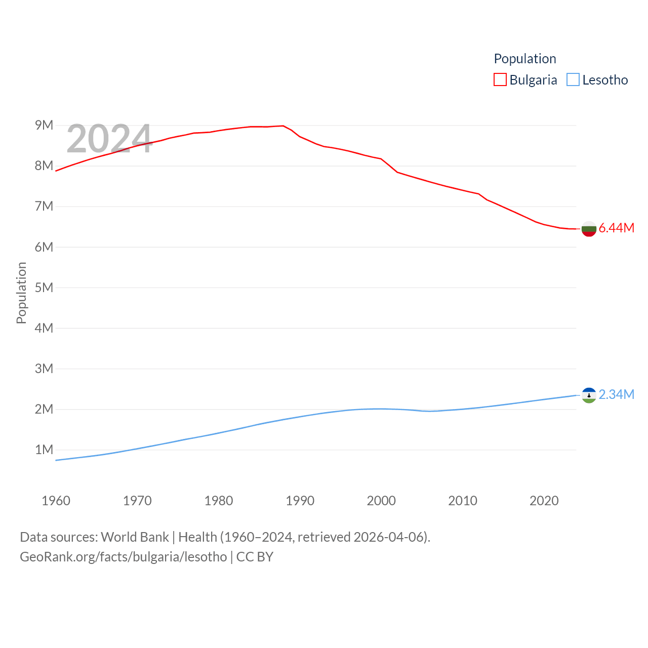 Bulgaria has a population of 6.44M (ranked 110/197), compared with 2.34M in Lesotho (ranked 145/197). Bulgaria's land area is 41,915 sq mi versus 11,722 sq mi for Lesotho (ranked 101st vs. 137th).