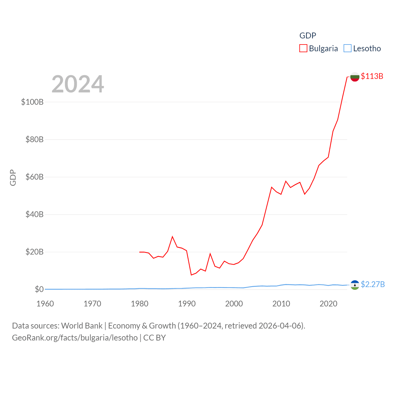 By GDP, Bulgaria ranks 67/197 ($113B) and Lesotho ranks 175/197 ($2.27B). By GDP per capita, Bulgaria ranks 64/197 ($17,596), while Lesotho ranks 181/197 ($972).