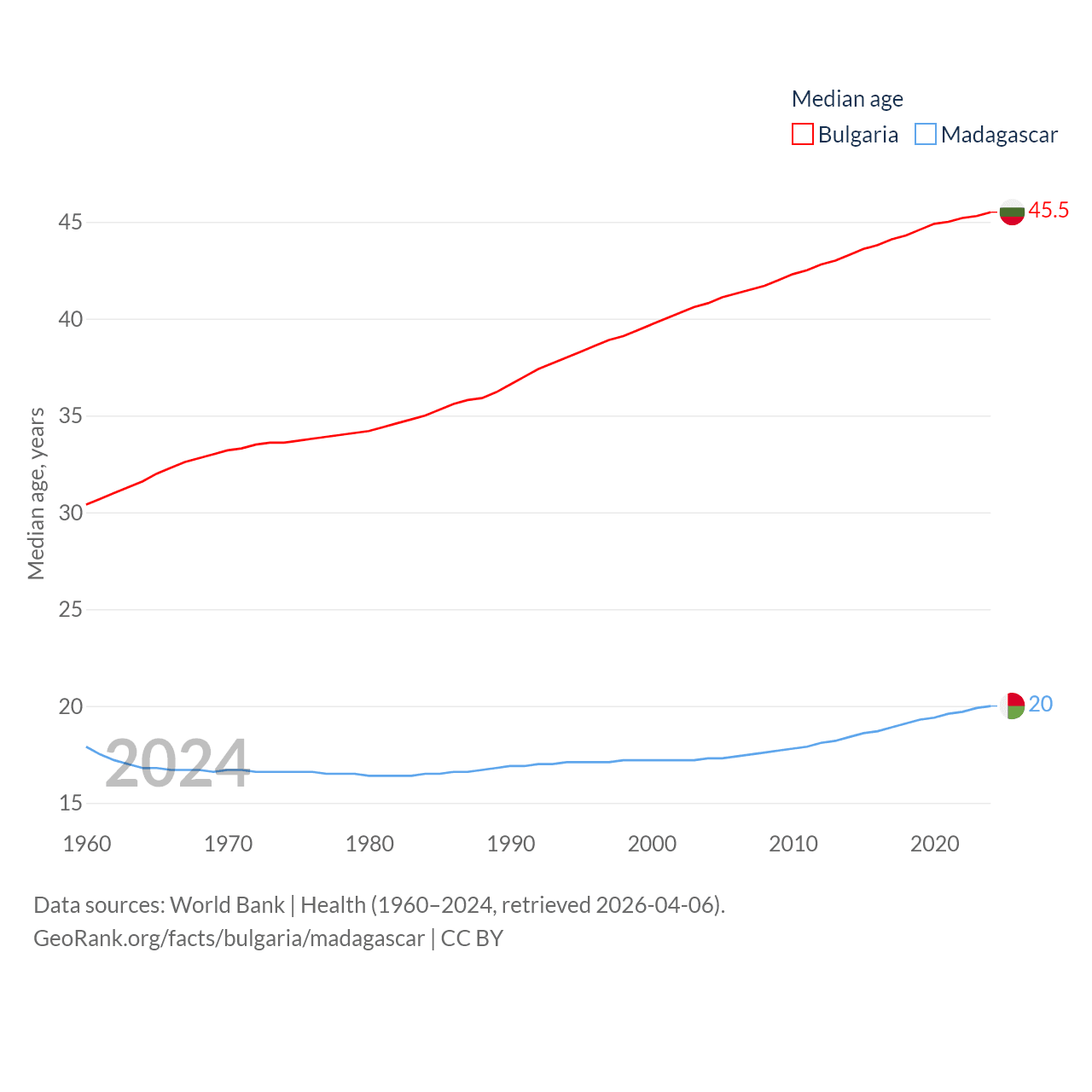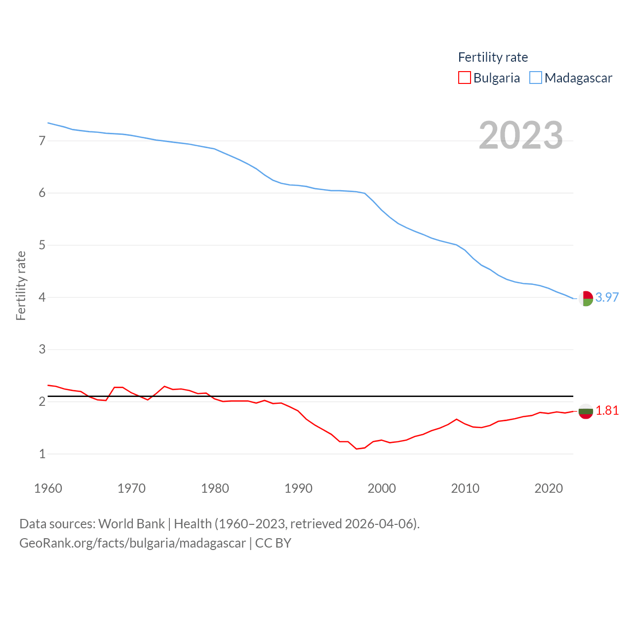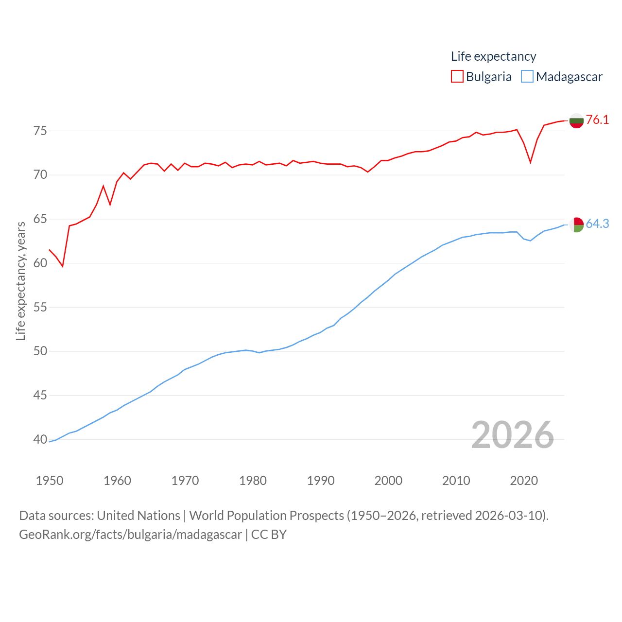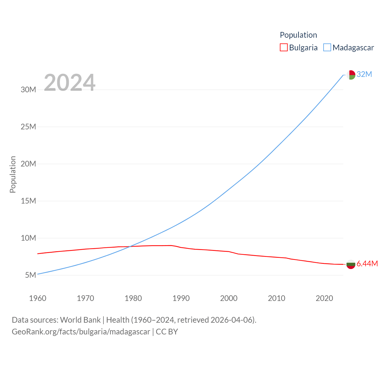 Bulgaria has a population of 6.44M (ranked 110/197), compared with 32M in Madagascar (ranked 49/197). Bulgaria's land area is 41,915 sq mi versus 224,634 sq mi for Madagascar (ranked 101st vs. 44th).