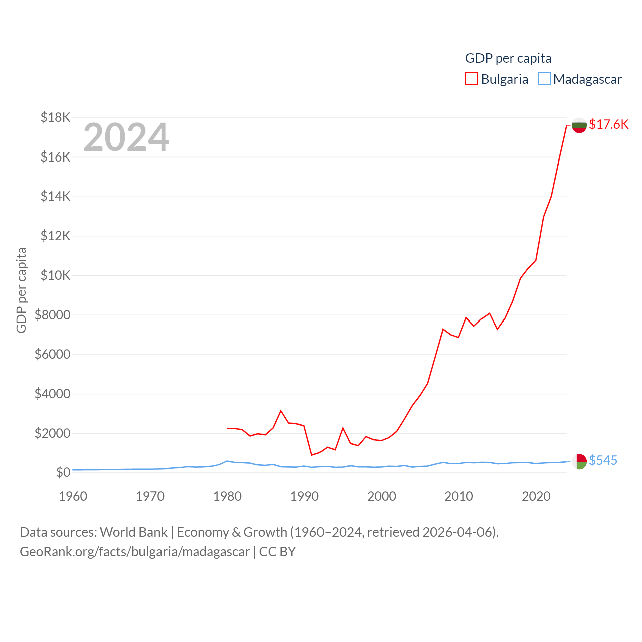 By GDP, Bulgaria ranks 67/197 ($113B) and Madagascar ranks 136/197 ($17.4B). By GDP per capita, Bulgaria ranks 64/197 ($17,596), while Madagascar ranks 193/197 ($545).