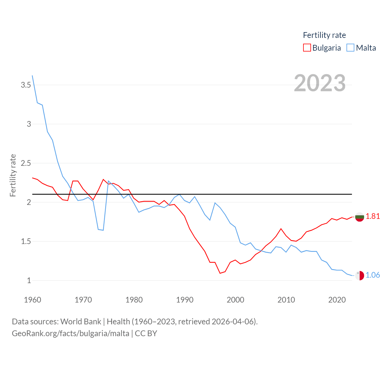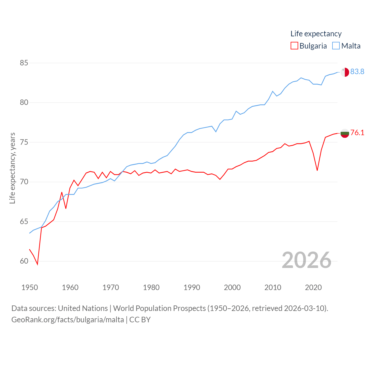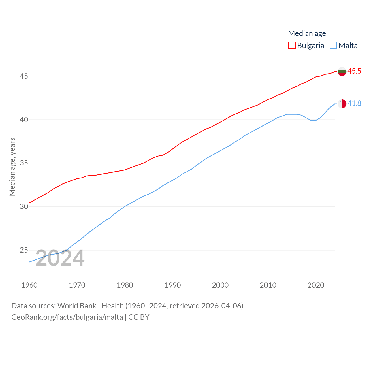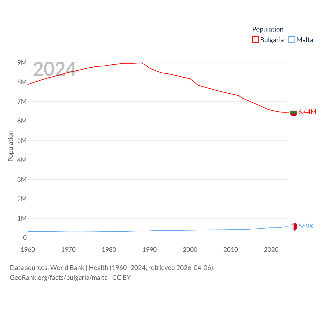Bulgaria has a population of 6.44M (ranked 110/197), compared with 569K in Malta (ranked 167/197). Bulgaria's land area is 41,915 sq mi versus 123.6 sq mi for Malta (ranked 101st vs. 187th).
