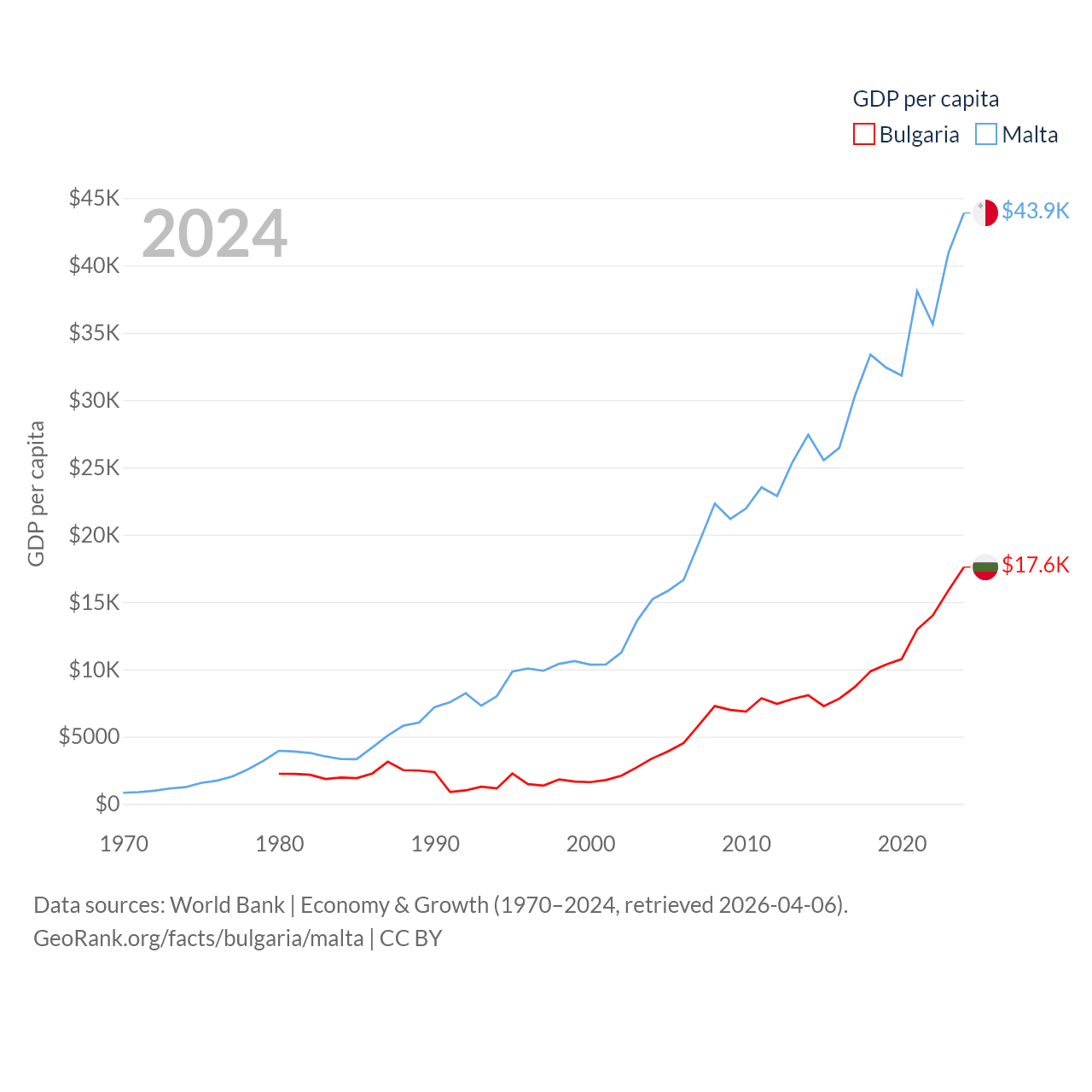 By GDP, Bulgaria ranks 67/197 ($113B) and Malta ranks 119/197 ($25B). By GDP per capita, Bulgaria ranks 64/197 ($17,596), while Malta ranks 28/197 ($43,899).