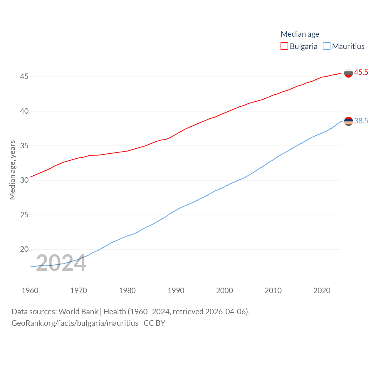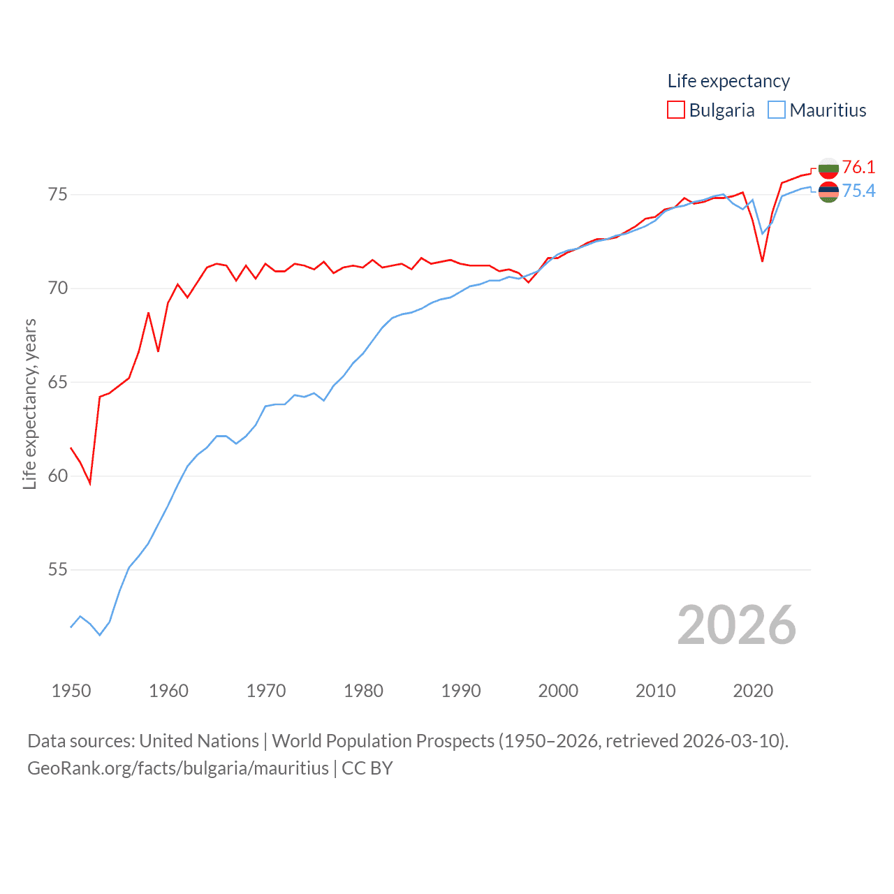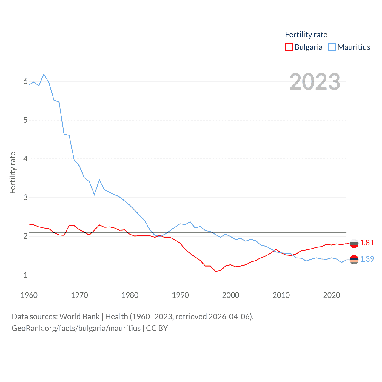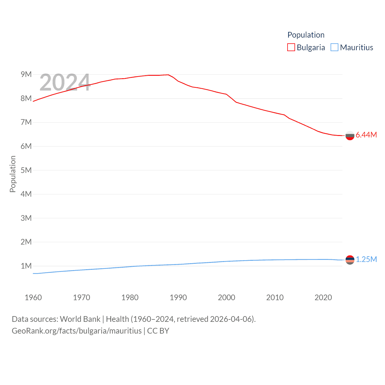Bulgaria has a population of 6.44M (ranked 110/197), compared with 1.25M in Mauritius (ranked 156/197). Bulgaria's land area is 41,915 sq mi versus 771 sq mi for Mauritius (ranked 101st vs. 170th).