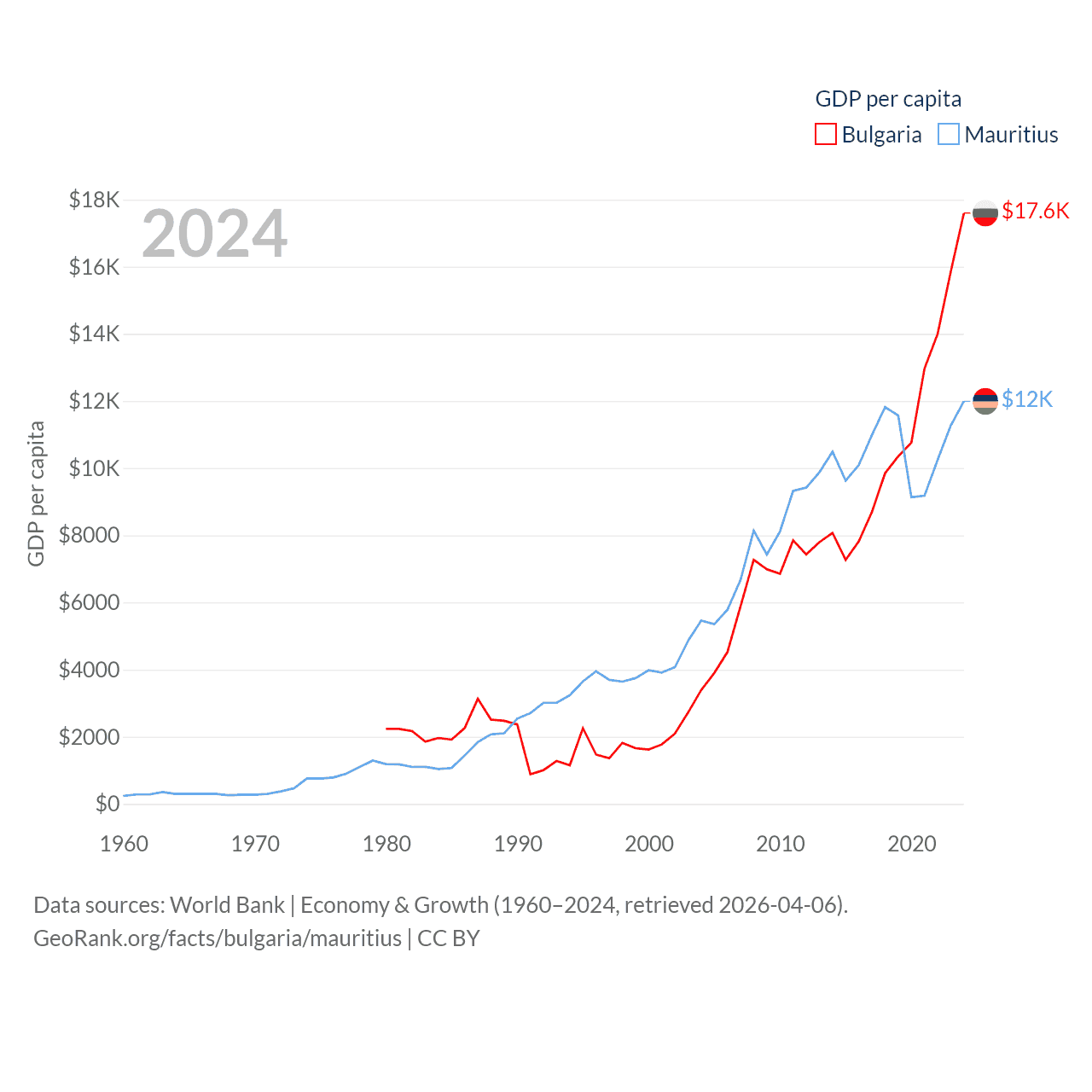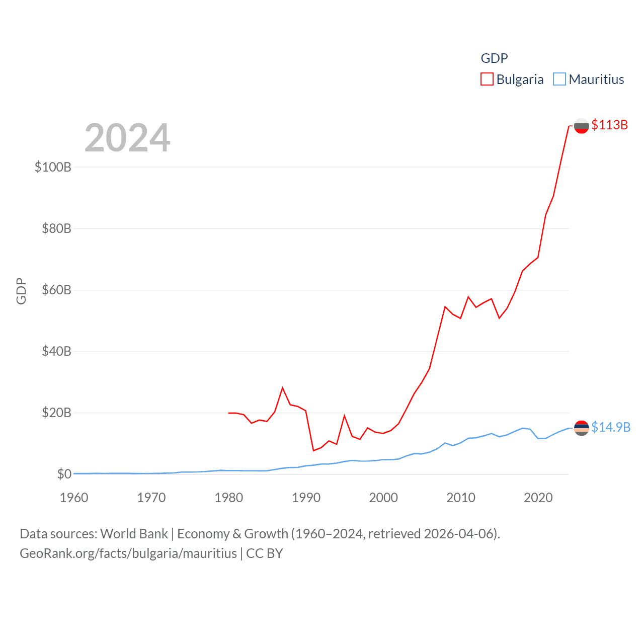 By GDP, Bulgaria ranks 67/197 ($113B) and Mauritius ranks 143/197 ($14.9B). By GDP per capita, Bulgaria ranks 64/197 ($17,596), while Mauritius ranks 78/197 ($11,991).