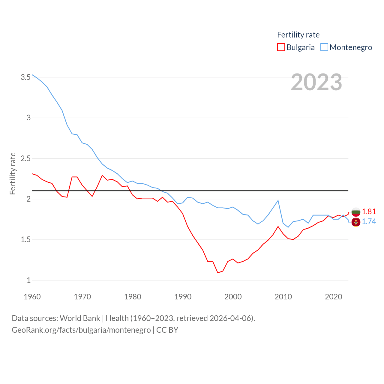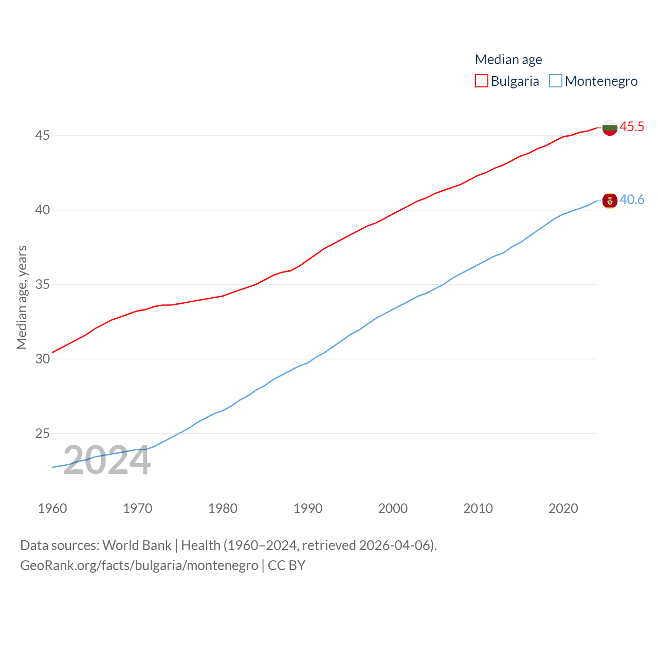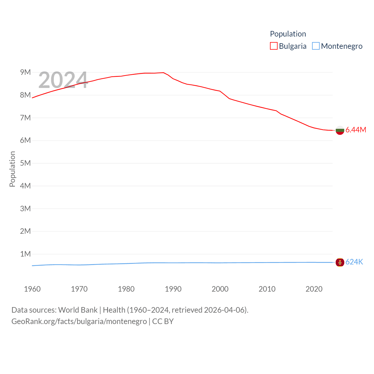 Bulgaria has a population of 6.44M (ranked 110/197), compared with 624K in Montenegro (ranked 166/197). Bulgaria's land area is 41,915 sq mi versus 5,193 sq mi for Montenegro (ranked 101st vs. 156th).