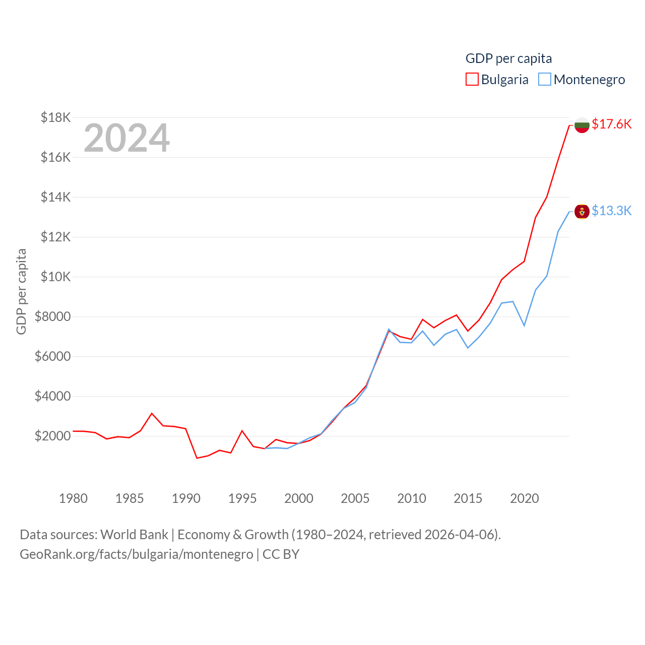 By GDP, Bulgaria ranks 67/197 ($113B) and Montenegro ranks 155/197 ($8.27B). By GDP per capita, Bulgaria ranks 64/197 ($17,596), while Montenegro ranks 77/197 ($13,263).