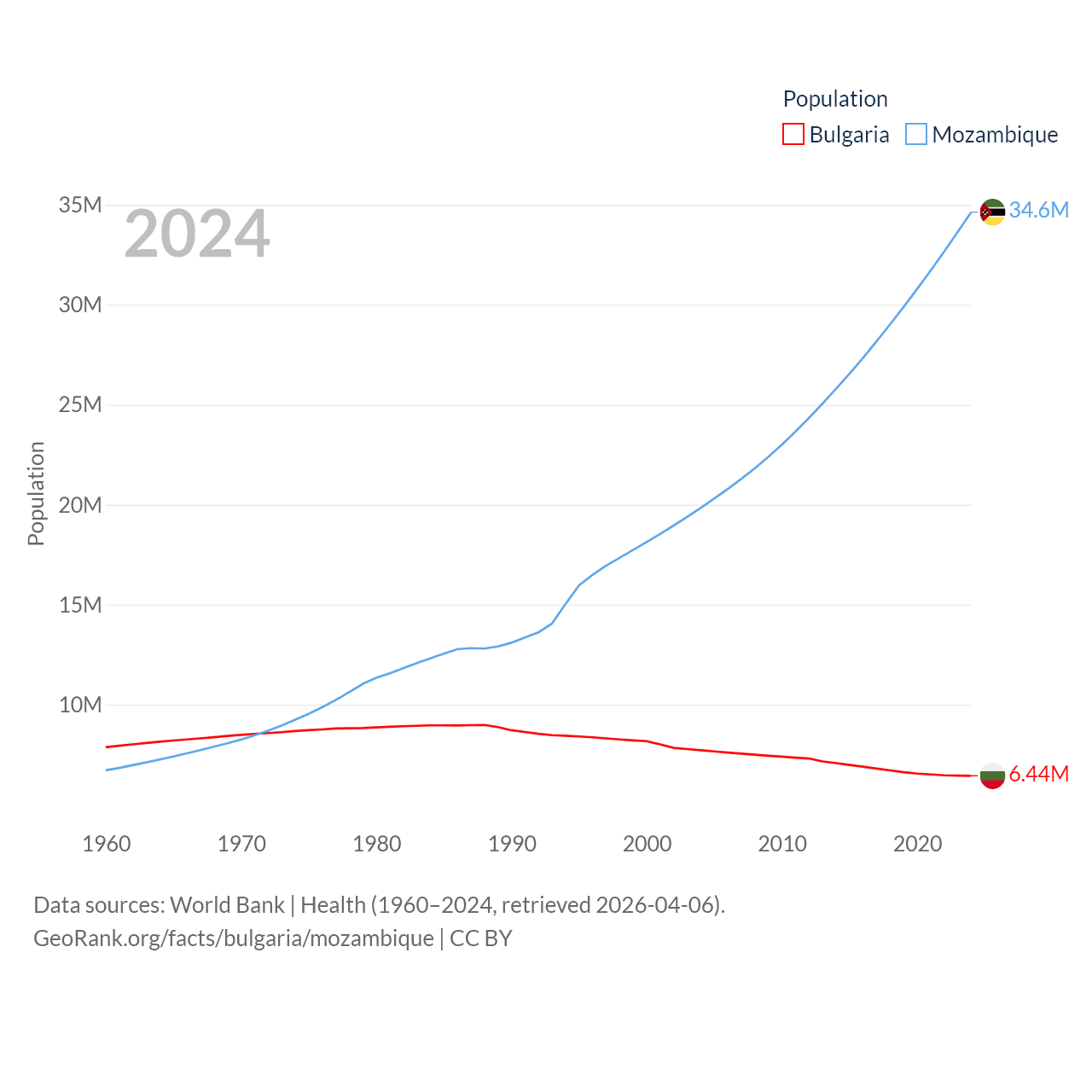 Bulgaria has a population of 6.44M (ranked 110/197), compared with 34.6M in Mozambique (ranked 46/197). Bulgaria's land area is 41,915 sq mi versus 303,623 sq mi for Mozambique (ranked 101st vs. 34th).
