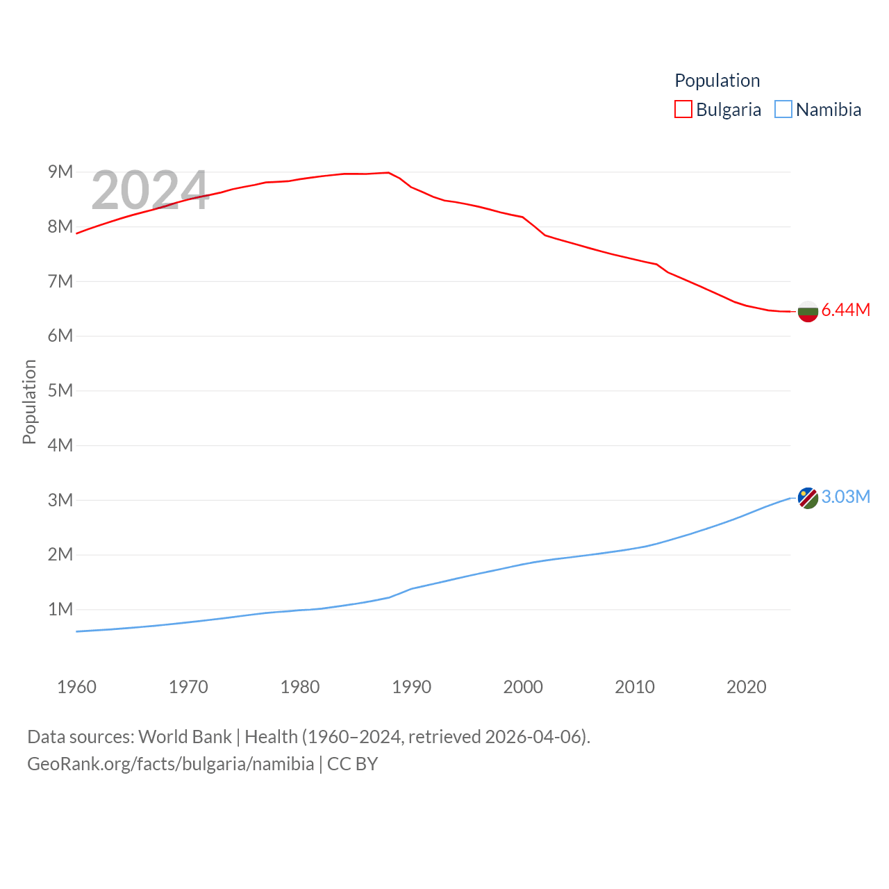 Bulgaria has a population of 6.44M (ranked 110/197), compared with 3.03M in Namibia (ranked 136/197). Bulgaria's land area is 41,915 sq mi versus 317,874 sq mi for Namibia (ranked 101st vs. 33rd).