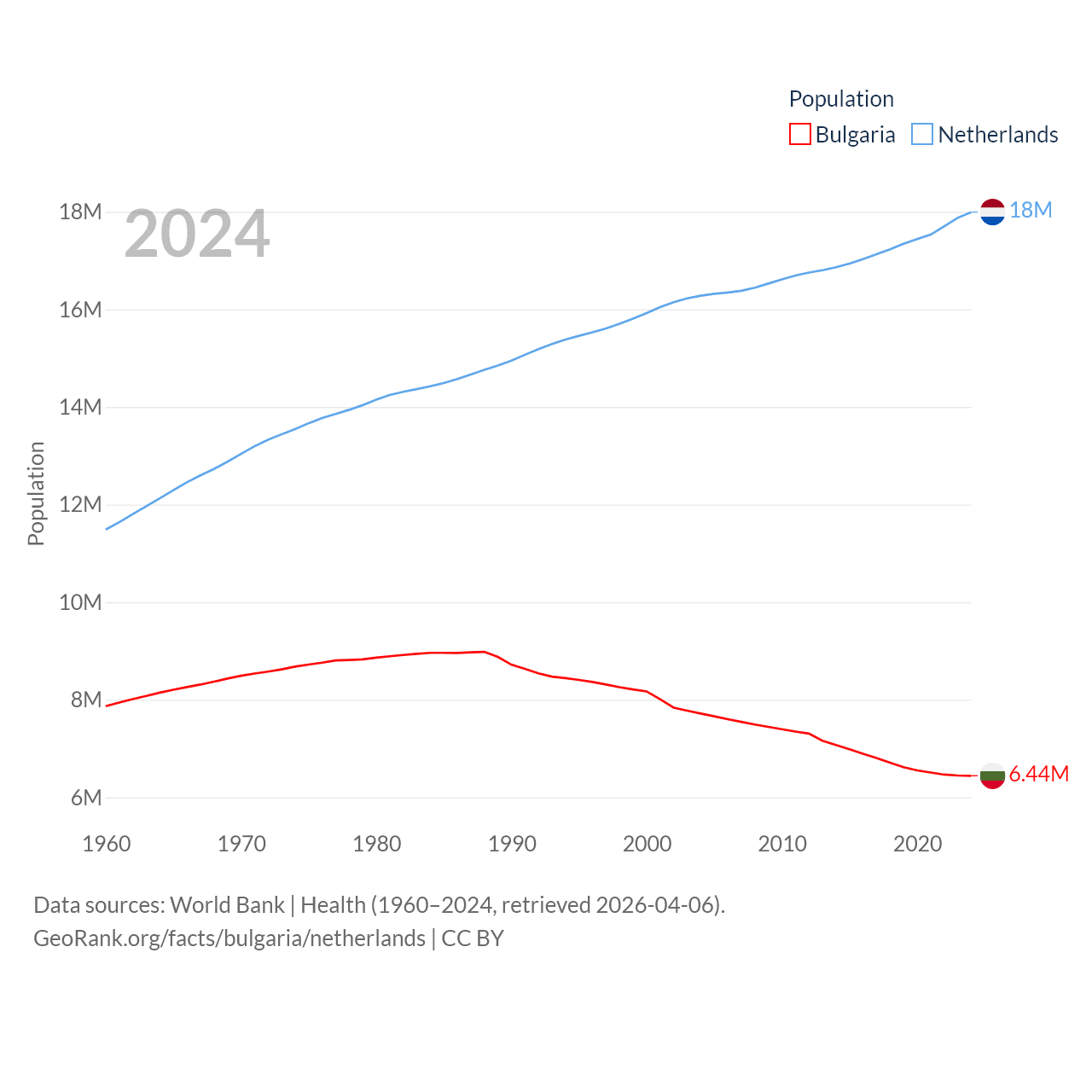 Bulgaria has a population of 6.44M (ranked 110/197), compared with 18M in The Netherlands (ranked 72/197). Bulgaria's land area is 41,915 sq mi versus 13,000 sq mi for The Netherlands (ranked 101st vs. 134th).