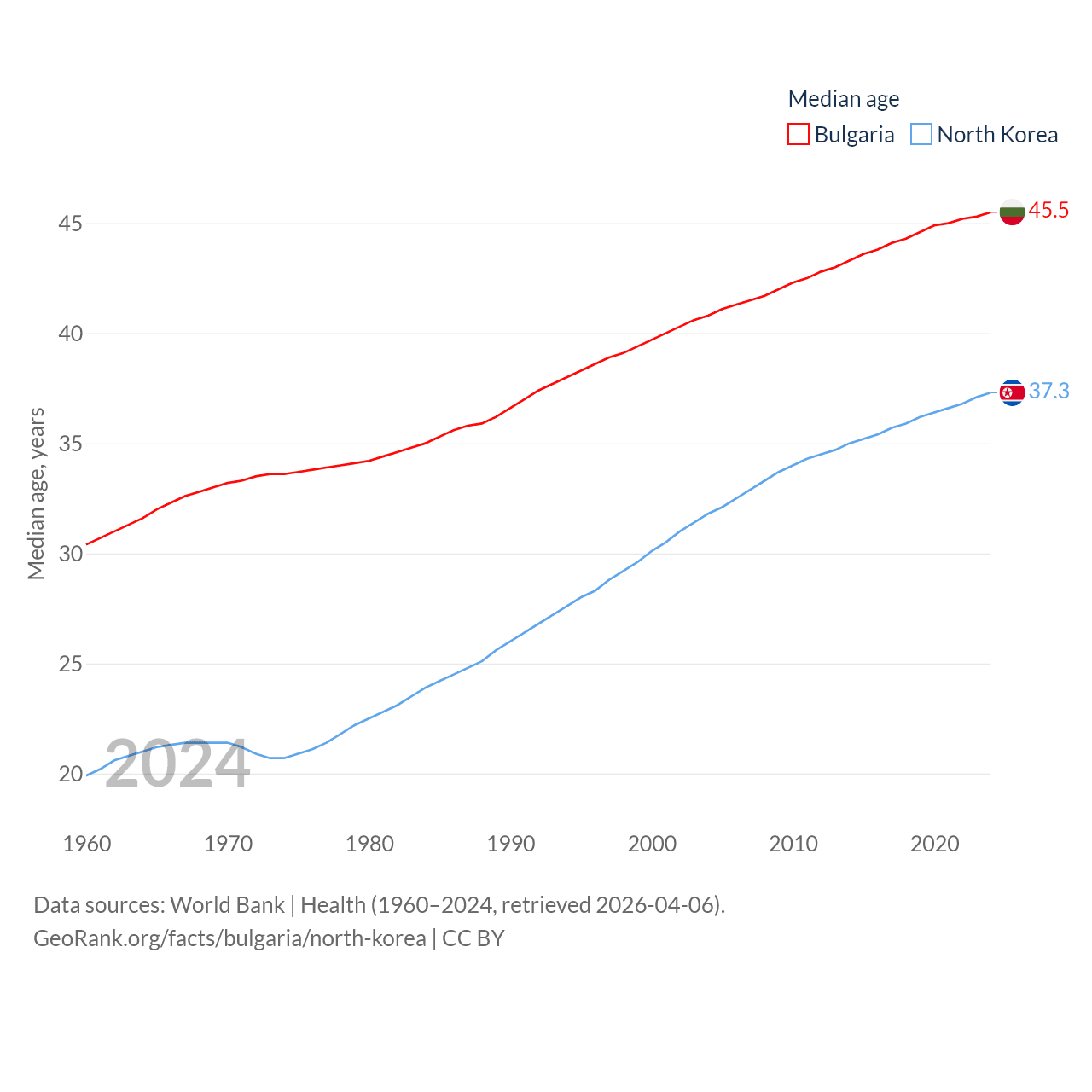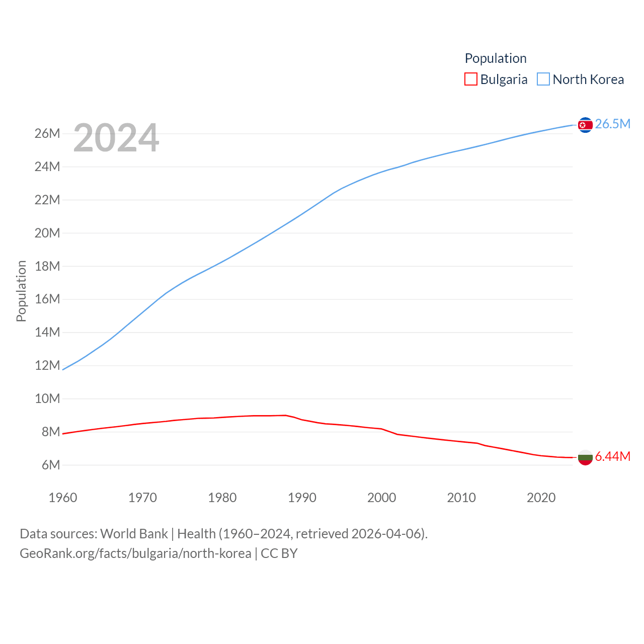 Bulgaria has a population of 6.44M (ranked 110/197), compared with 26.5M in North Korea (ranked 56/197). Bulgaria's land area is 41,915 sq mi versus 46,491 sq mi for North Korea (ranked 101st vs. 97th).
